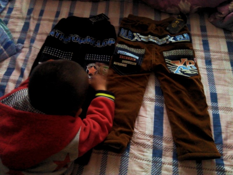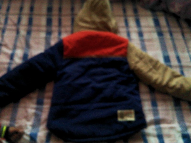 前几天收到货后,就准备给儿子试试的,这小子看了一眼就说能穿下,都不肯穿。后来还是在我的强制下才试穿了下,这家伙就记得玩,让他试件衣服都没有时间。想想还是觉得奇怪,难道这小子看一眼就知道衣服能不能穿?!这棉袄试穿稍微大一点,马等天冷加衣服就大小刚刚好了。