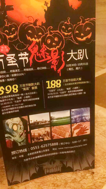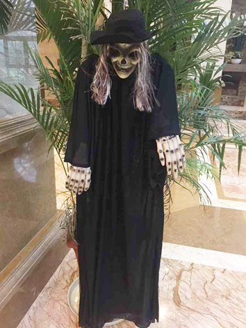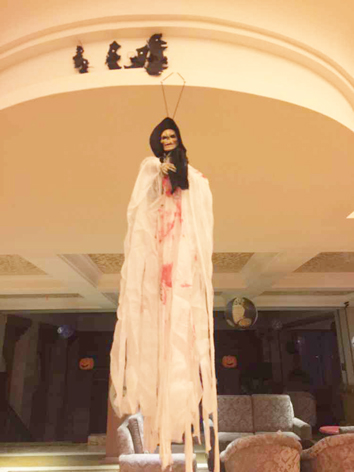 不过当我抬头一看的时候,自己也被吓了一跳,在酒店的正前方有一个吊着的女鬼,她穿着一身白衣,还好我没有带孩子,不然的话我想晨晨会被吓一跳的,酒店的灯光是比较足的,如果灯光暗的话,还是比较吓人的呢,而且酒店的各个角落你都会在不经意间发现很多这种装扮,西方的万圣节离我们越来越近了。