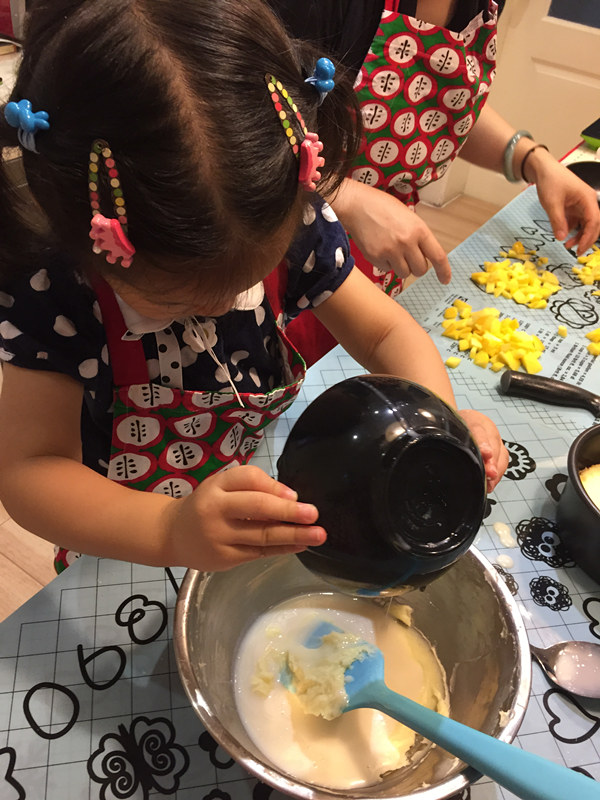 小妞是个不折不扣的小吃货,最爱各类蛋糕、甜品,那天群里有妈妈说她大女儿所在的培训机构有个亲子DIY体验课招募,想到宝宝吃自己亲手做的蛋糕一定很开心就为她报了名。 ![]() 小妞虽然已经不是第一次DIY蛋糕了,但以往的亲子厨房很多原材料都帮宝贝准备好,比如只用在蛋糕上加上奶油,而这次从蛋糕胚制作到慕斯部分的制作都要亲手完成。