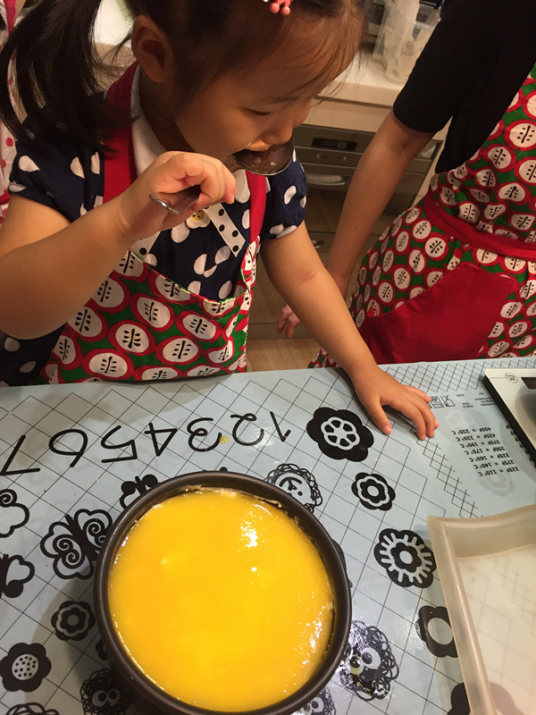 ![]() 而后是把新鲜的芒果切片,一部分作为芒果肉原粒拌在慕斯层中;一部分则在搅拌机里打成泥,放在蛋糕的最上层,这样芒果口味的慕斯蛋糕就算大功告成了。可是心急的小妞太渴望尝尝味道了,于是老师贴心的给小妞一个大大的芒果核啃着过把瘾。 ![]() 在等待慕斯蛋糕冰冻成型的时候,小妞和一起做蛋糕的哥哥姐姐做起了游戏。一会儿躲在桌子底下躲猫猫,一会儿玩起了石头剪刀布,虽然哥哥姐姐比小妞大出很多,但她丝毫不怕生,和哥哥姐姐玩的很热乎,小哥哥还特别保护她呢! ![]() ![]() 在20分钟的等待后芒果慕斯完成了。哇。看着香甜诱人,这金亮的黄色全都来自芒果原汁,完全没色素、任何添加物。这也就是为什么我们那么热衷于自己DIY蛋糕,因为既美味又安全。 ![]() 老师为每个孩子都装备了精致的蛋糕纸盒带回家。 ![]() 再来看看倒模后的样子,虽然边缘还不够饱满,但味道绝对一百二十分!尤其是小妞吃起自己做的蛋糕,更是回味无穷。