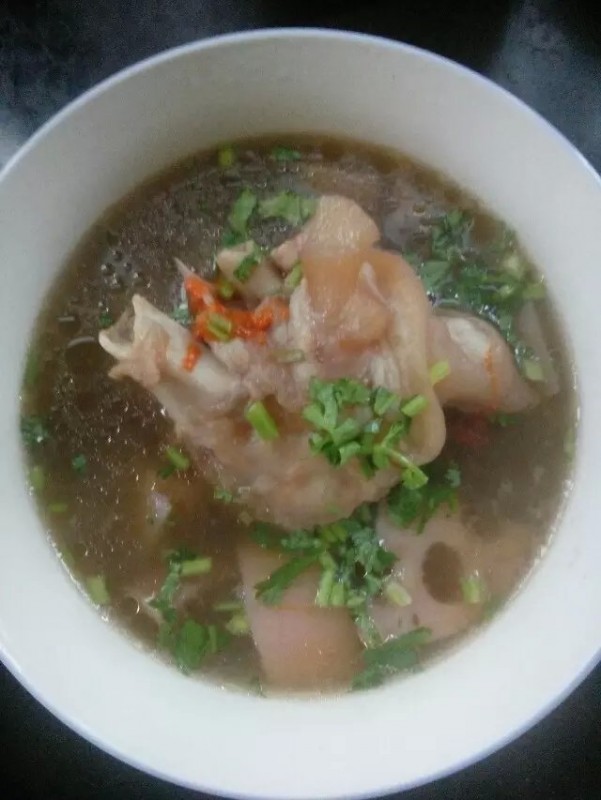 都说南方人比较擅长煲汤,不过我这个北方人最近也喜欢煲汤了。提前练习下以后好做的熟练,都说这个猪蹄汤比较适合产后月子的女人。比较适合产后下奶的。我也不太懂就想自己做做看,也可以很熟练做给家人和宝宝了。最近频繁的发表美食呵呵朋友同事都说我 成贤妻良母了,自己到没有觉得就是为了打发时间等待宝宝出生。不知道宝宝在妈妈肚子里喜欢不喜欢呢?只希望宝宝可以健健康康出生,漂漂亮亮的哦!呵呵这也是我 一直的美好想法。 首先我们准备好食材猪蹄一个,黄豆一把,莲藕一个,枸杞一些,盐,姜片,料酒。我昨天买的猪蹄比较大一个就够了,记得买时就让剁成块哦!这样我回来就不用弄了,家里的刀也不如卖肉的锋利的。再就是回来还要把那个猪蹄上偶尔还会有的几根猪毛弄干净了,我放在火上寮了一下就可以了。昨天着急忘记拍照了. 然后1用热水把黄豆提前至少一个小时泡好,将猪蹄洗净放入锅中,加姜片料酒和水。确保水没过猪蹄就可以了。开小火煮。2当猪蹄煮开时用勺子飘去表面的浮沫。然后换另一锅开水放入猪蹄和黄豆一起煮四十分钟。3把莲藕去皮切块加入汤中,如果提前切必须放水中要不莲藕会发黑。枸杞洗净同莲藕一起放入汤中,再煮半小时左右。这一步很关键的就是一定要等猪蹄煮烂肉跟骨头散了再放入莲藕和枸杞。要不莲藕会很棉。喜欢脆一点就一定要注意了。4加适当盐再略煮五分钟关火就可以了。 这样这道美味的猪蹄汤就做好了,是不是很简单哦!汤中的莲藕特别好吃我昨天放点少了。喜欢的朋友可以在家试试了,特别适合月子的女人哦!汤很清谈并不油腻的。而且猪蹄的胶原蛋白对于女人来说很有美容的效果哦!黄豆的味道很清香的。只有成品图一张大家可以看看了。
