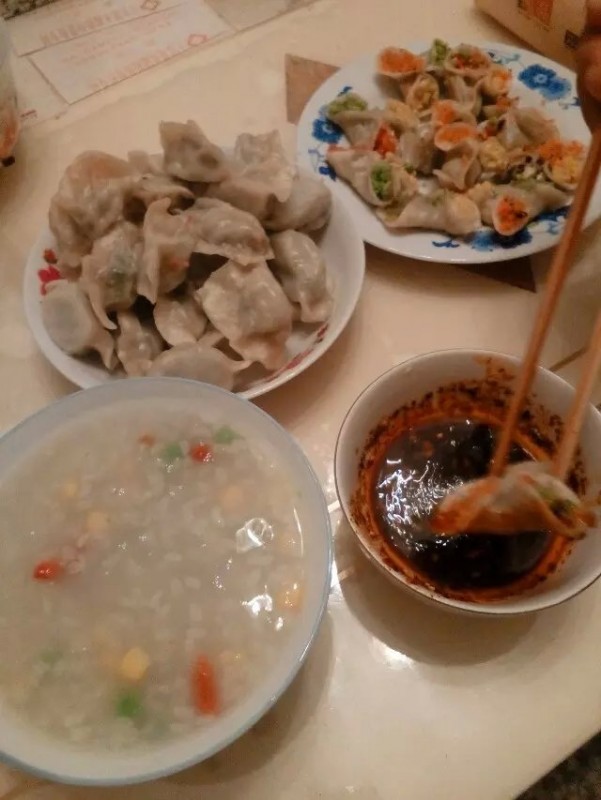 ![]() ![]() 第三步:也是比较麻烦的一部了,就是开始包饺子了。我是提前买好了饺子皮,其实最好做蒸饺自己用开水和面比较软而且也好包。取一张饺子皮,在中间包上茴香肉馅。把四边拉起捏住,在 要粘合的地方 用手指沾一点水这样好沾的牢固一些。相邻的而两边再粘合就可以了,撑开四个口袋分别填入四色馅 。可以把边边稍微捏一下呈花瓣形,这个真不好弄要慢一点。我费了好大功夫捏了一盘剩下的天不早了我就包成普通的饺子样子了。 ![]() 然后就做完了开始放禁了水的蒸布放锅里蒸十五二十分钟就可以出锅了。我一边做蒸饺的时候也就放另外一边锅把八宝稀饭煮好。 其实就是用剩下的玉米和青豆加了一些枸杞进去和糯米一起煮,这样出来的粥很黏很好喝,要是喜欢很甜的朋友可以再加入一些蜜枣就更美味了。 最后 我用蒜泥调好蘸汁配蒸饺真的不错哦!看着还不错吧!不管如何这是我的一点心意。晚上老公回来很感动哦!夸我越来越能干了呵呵!辛苦值了。