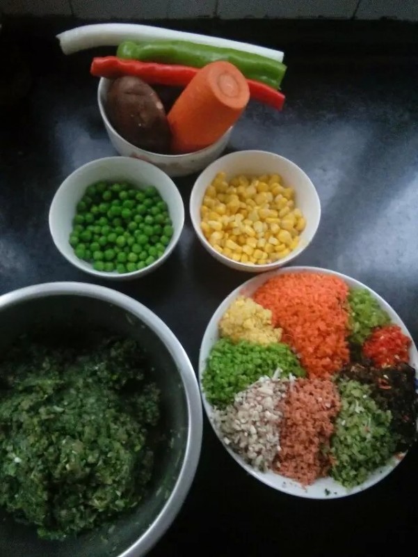 从相识到相恋从不会做饭到现在凑合会做一点,朋友眼中的我确实改变不少。呵呵!现在已经是贤妻良母类型了。是不是自恋了。不过是大家看完现在每天都做饭罢了,其实对于我这个原来从不踏进厨房的女人已经算是进步了。昨天是老公三十一岁的生日,我是第一次给他准备生日饭。本来说好去外面吃饭的不过想来想去还是在家比较好。婆婆嫌我身体不方便天气也冷老公也是说了不让准备的,可我还是简单的准备了一些。觉得在家做饭这个生日对于他和我来说更有意义的。本来我准备了长寿面的可是时间来不及了,就没有做。老公不让给他过就是因为有婆婆公公在,父母都不过他过什么生日。说的是这样我觉得老公说的也有道理所以也么准备蛋糕。只是我们大家都知道昨天是老公的生日。 不过是这顿晚饭也是让我费了好久的功夫了。我中午吃完饭就开始准备材料了,一直做到晚上婆婆下班才弄完。整个一个下午都是在厨房度过的。虽然是感觉有点累不过心里还是很高兴的,老公不愿意我做就是不想让我太累。我还准备了几个菜可是时间来不及都没有炒。晚饭就只有四喜蒸饺和猪蹄汤和八宝稀饭了。是不是很简单哦!关键就是那个四喜蒸饺好费时间的,第一次学做不太会很麻烦的。就尽力做了不太好看不过蒸饺吃起来还是不错哦婆婆公公都说我真有耐心了。但是以后还是不让做了胎费时间还很累,都怕累着我了。不过这个颜色搭配的确实不错很漂亮的。好了不罗嗦了下面给大家分享这个过程了:材料:猪肉 大葱 胡萝卜 黑木耳 黄瓜 茴香 火腿肠 玉米 青豆 香菇 青椒 姜丝 料酒 十三香 花椒粉 香油 生抽 盐 鸡精 第一步:把需要的材料全部切好备用,我就不一一说了。全部食材切末剁碎备用。 第二步:就是先把茴香开水中焯下捞出拧干水分备用,然后把肉切丝再剁碎和大葱姜丝茴香一起剁碎。茴香的水一定要拧干,不然包的时候就很麻烦。肉馅备好准备好其他需要的材料,把肉馅放调料调好腌制一会就可以了。这个时候开始准备其他的东西。