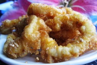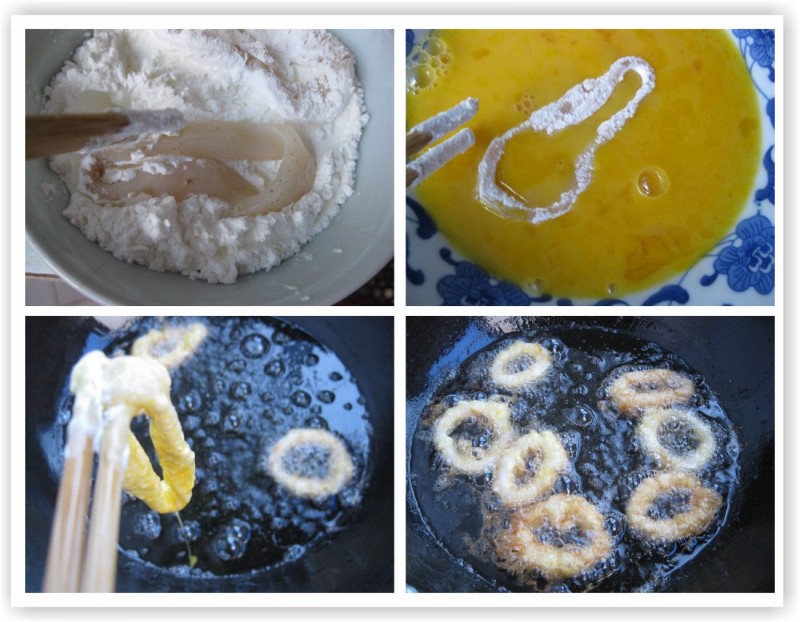 ![]() ![]() 其实有很多东西做出来都不好吃,不是说那道菜不好吃,而是说这道菜让我做的不好吃了,每次我充满期待的问老公:“好吃吗?”的时候,老公总是翘着大拇指说:“好吃,老婆做的都好吃。!”但是我知道老公那是骗我的,哈哈,不过老公还是很给面子的都吃上一大半。 ![]() ![]() 看到老公这个样子,我就决定一定要学会做菜,这不,昨天在网上看了一道家常炸鱿鱼圈,感觉挺简单的,就决定要尝试着做做看,于是一下班就去菜市场买了三条鱿鱼,先看看我的成品吧! ![]() 看着还不错吧,知道我是怎么做的吗? 先将新鲜鱿鱼去掉头和内脏,撕去外皮,切差不多一厘米宽的圈,加上料酒、葱、蒜、姜蓉再加入适量的盐和五香粉,搅拌后腌制半个小时,再讲两个鸡蛋打入干净的碗中,搅拌均匀;然后再找一个干净的碗倒入适量淀粉;锅里倒入油,将鱿鱼圈在淀粉里滚一下,再放到鸡蛋里滚一下,慢慢放入油锅里,等颜色变成金黄时捞出来就可以啦,喜欢的话可以撒上点白芝麻,就更漂亮啦! 不得不说——我真棒!哈哈哈哈哈哈!