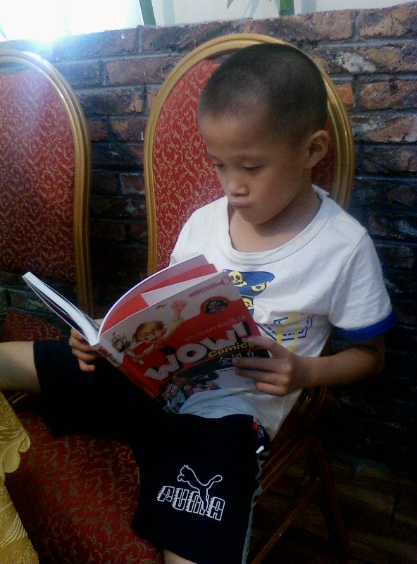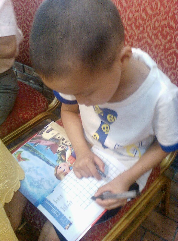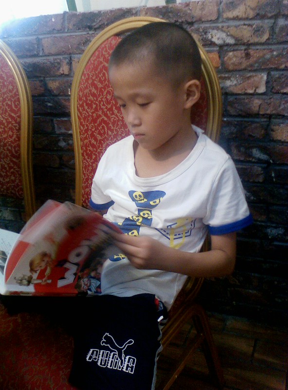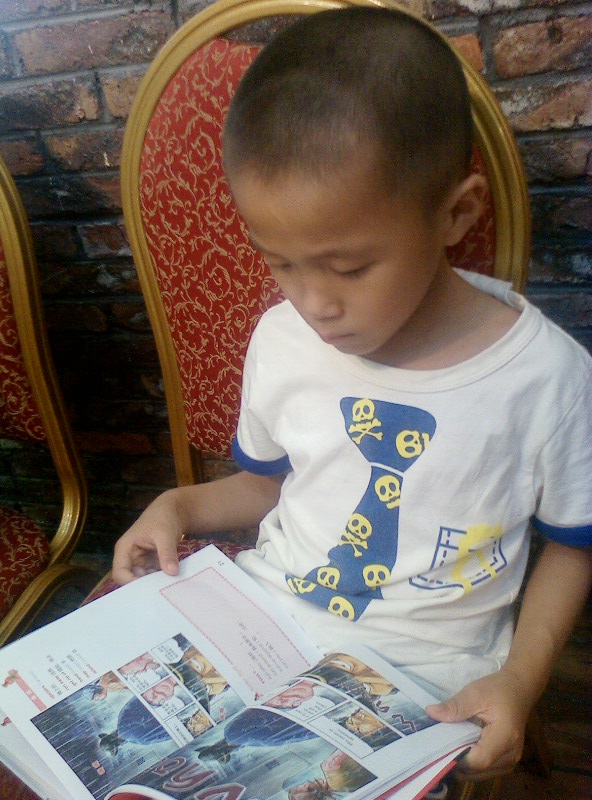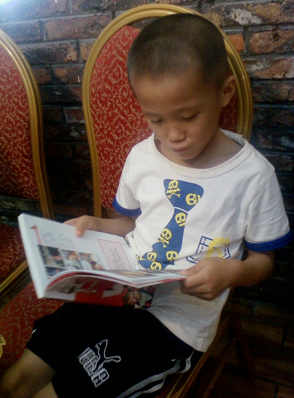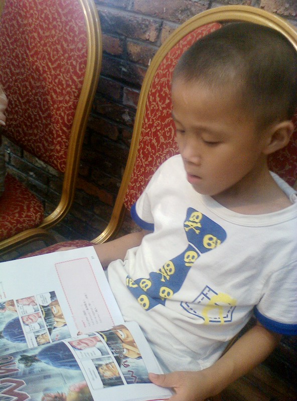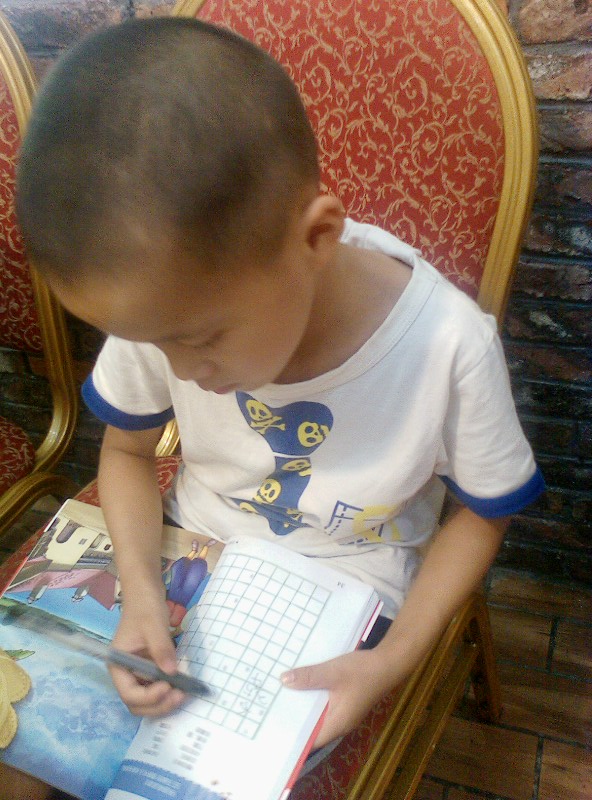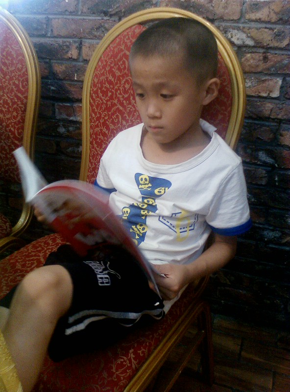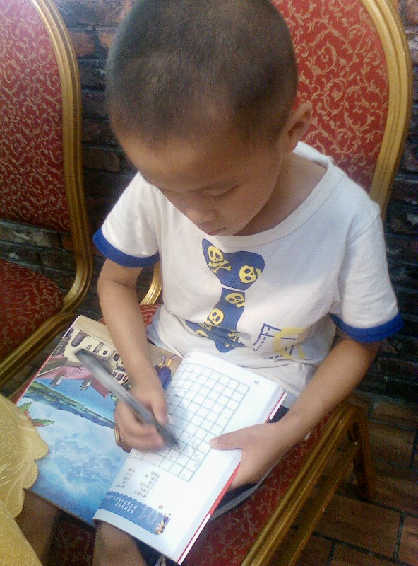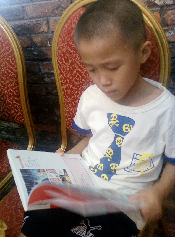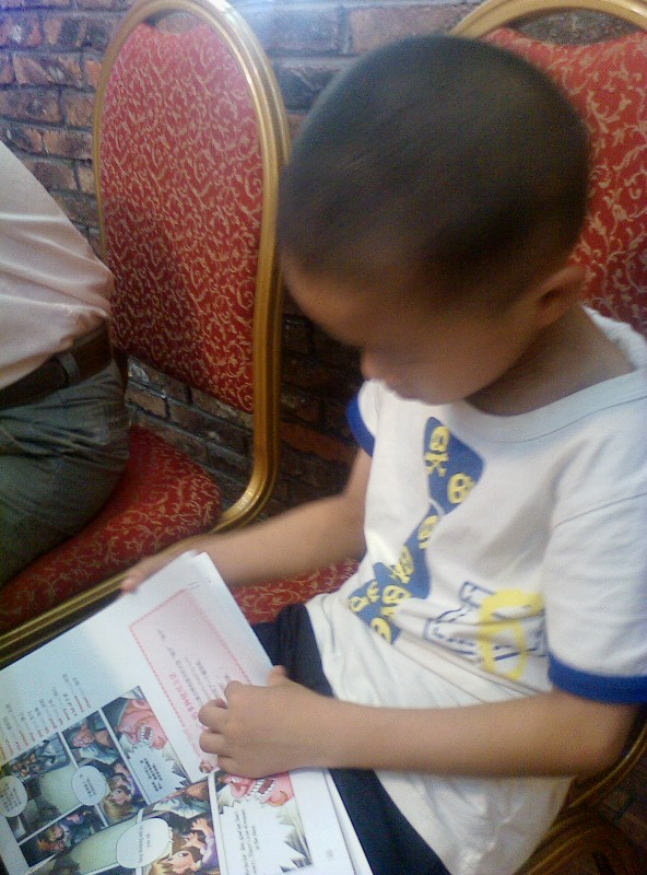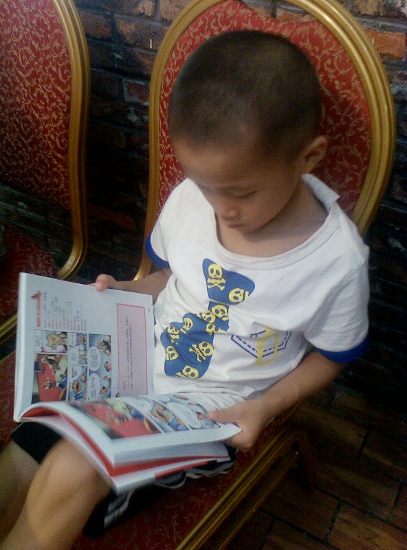 我们家的一个优点就是:一本书没有读完,他是不会再做其他事情的。)知道他的习惯,我们5个大人也不催促他,先开吃了。他呢,自己读得津津有味,还一个劲的问我要笔,我纳闷哪?敢情他还真看懂了?