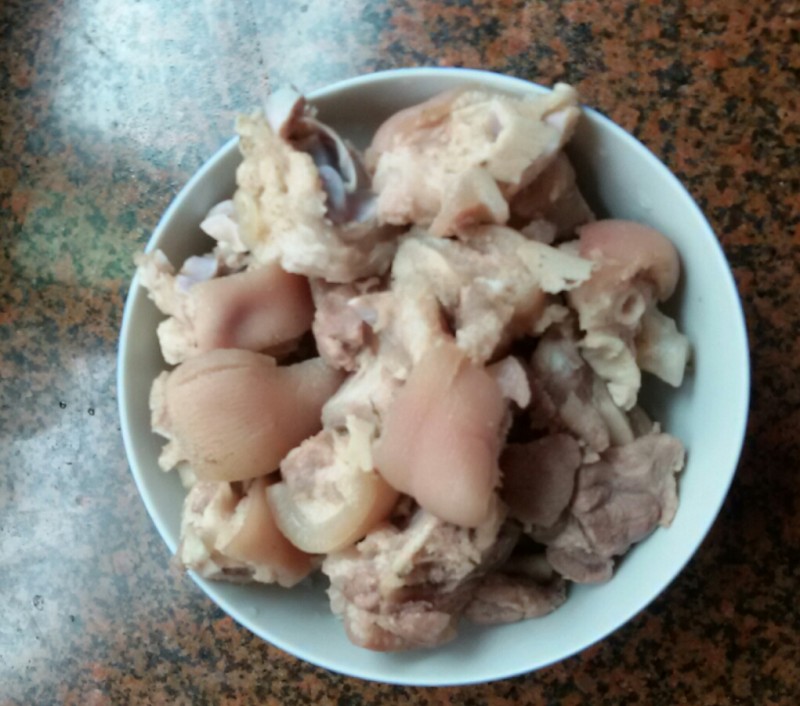 猪脚是前几天从乡下拿回来的,拿回来之前猪脚已经被老爸砍成块了。可昨天当我把冷冻室里的猪脚拿出来时,我才发现猪脚上原来还有很多的毛未被拔光,于是我就发愁了:如果猪脚是完整的,我可以用火去烧猪脚上的毛然后再用刀来刮猪毛就很容易去掉了,可现在猪脚却被砍成块了,所以这种方法是行不通的。无奈之下,我就尝试着用手去拔,可拔来拔去,居然“一毛不拔”,一根猪毛我也拔不下来,那一刻我就想放弃做猪脚姜了。 可后来我想了想,觉得我不应该辜负老爸老妈的好意,更不应该浪费这来之不易的土猪猪脚,然后我就想到了用眉钳来拔猪毛了,然后我就把好久不用的眉钳找出来清洗干净,然后用开水把猪脚烫过捞起,然后再用凉水冲洗一遍,然后我就开始挑出有猪毛的猪脚来拔毛了。