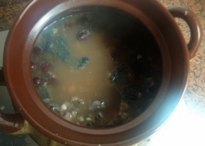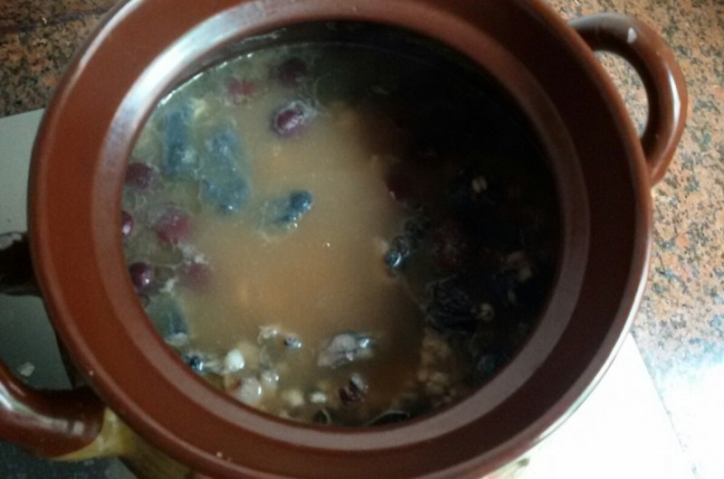 考虑到用家里的炖盅不是很大,所以我就改用砂锅煲汤阿胶鸡汤了。 材料准备: 阿胶20克,芡实50克,薏米70克,生姜三片,乌鸡半只(约500克),红枣7枚(去核),龙眼肉适量 步骤: 1、 先用水把芡实和薏米洗干净,然后用清水浸泡半小时到一个小时左右,捞起备用; 2、 乌鸡洗净斩块,备用; 3、 铁锅烧热,然后加入适量的花生油,然后下生姜片爆一下,然后把乌鸡放在锅里炒到变色即起锅,备用; 4、 砂锅洗净,然后把所有材料放入砂锅内,然后加入适量的清水大火烧开,然后调成慢火煲两个小时; 5、 调味,晾到温热时喝汤吃肉; 老实说,我是第一次用阿胶煲汤,本以为阿胶的味道会比较浓,汤会不太好喝,想不到这汤却非常的好喝,而且没有任何腥味,因为有薏米和芡实在吸油,所以这汤喝起来也不油腻。