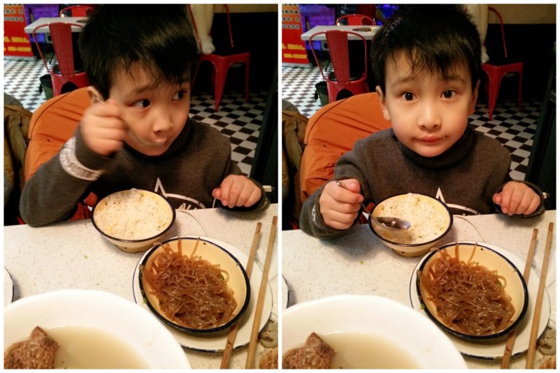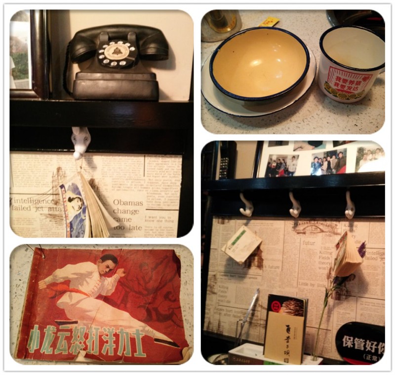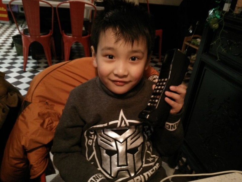 这几天天气不好,但是我们总想出去走一走、玩一玩,因为外面的空气特别清新,感觉好难得啊。趁着雪停了,一家三口踏着雪走出去,去新开的商场逛一逛,去新开的餐厅吃一顿美食。Aric不乐意,他看到了德克士,很想吃汉堡薯条,可是最终1票没有通过,陪着我和老公去吃了美味的海鲜烩。这是个70、80餐厅,很有特色,所有的餐具都是我们小时候用的那种搪瓷的。Aric第一眼看到就说这个杯子是爸爸用的,没错,前几天我还给他买了一个,养猪专业户的搪瓷杯子呢。 餐厅里的装修比较有小时候的特色,例如大哥大、带线拨盘的电话,还有小人儿漫画书等。Aric拿着大哥大问这是什么?老公告诉他是大哥大,就是手机。Aric纳闷,为什么这个手机这么大呢?怎么使用?老公就教他认识大哥大,告诉Aric,想当年第一部手机可就是大哥大哦,那时候一部大哥大是一万多块钱,只有非常有钱的人才用。Aric感慨还是现在的手机拿着方便,那么薄、那么轻,各种的智能,多高大上啊。哈哈,所以现在大哥大已经成为珍藏品了,很值得怀念。