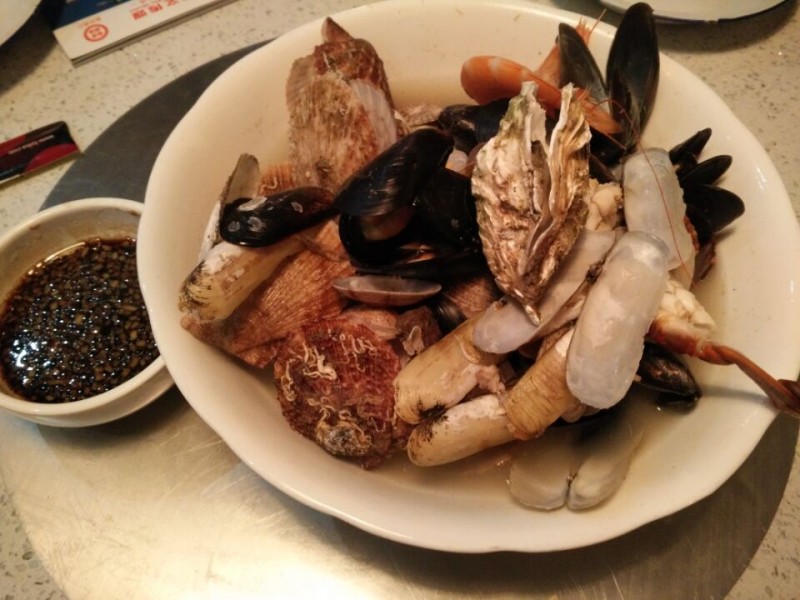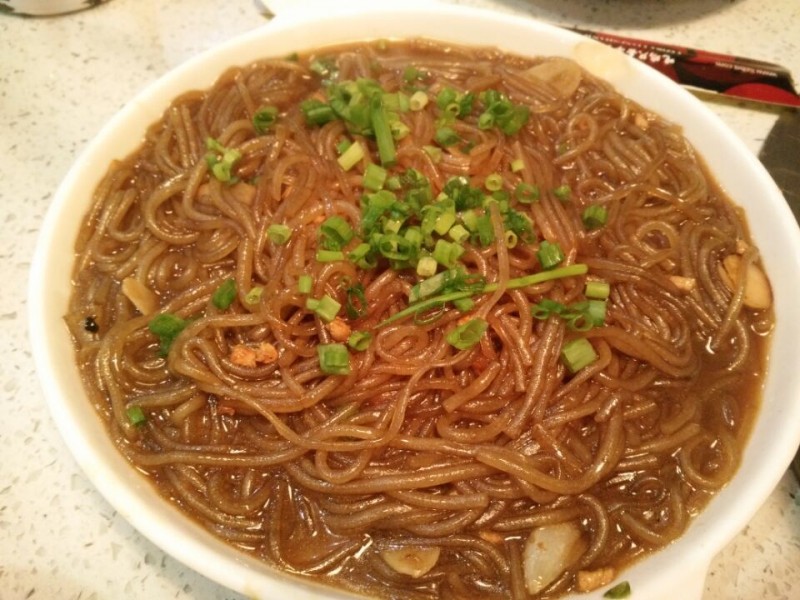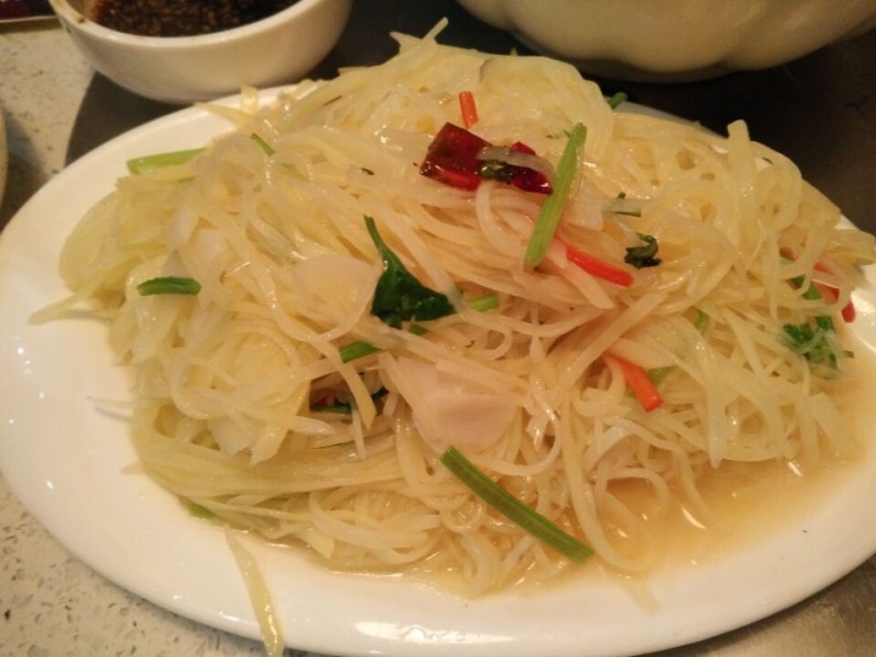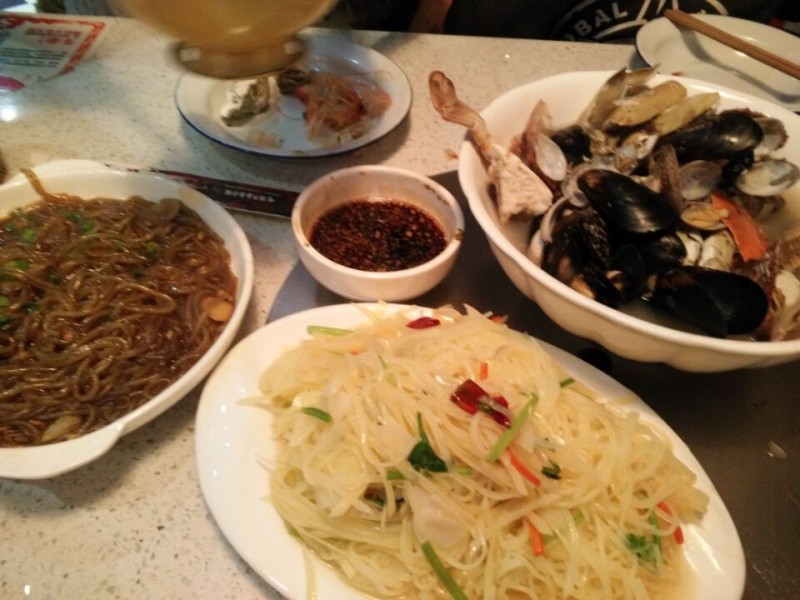 我们点了一个海鲜烩,这原本是香辣海鲜烩,可是因为Aric,就没有放任何辣椒,味道自然也非常清淡了。海鲜烩里有很多海鲜,例如蛤蜊、扇贝、大虾、螃蟹等,估计有六七种海鲜了,只是好几种我不知道叫什么。我不太爱吃海鲜,Aric也是,基本上那么一大盆都被老公吃掉了,我们也只吃了大虾和螃蟹而已。这一份海鲜烩是88元,老公说不太值得,这个会过日子的男人想到的是不如自己去买海鲜一锅煮了,味道绝对更好,也更鲜,最重要的是,自己做的更超值。 另外点了肉末粉条和酸辣土豆丝,都是我们常吃的菜。Aric相比较喜欢肉末粉条,因为土豆丝被我要求放了辣椒,否则所有的菜都是不辣的,也没什么味道啊。主食是米饭,老公心疼儿子,看他没怎么吃海鲜,就单独要了一份蛋炒饭,就这样一份蛋炒饭就要了20多,虽然没什么特色的感觉,但胜在量多。老公说这绝对够一家三口吃的了,可惜我还单独要了米饭,撑着了也没吃了。下次再来这里尝尝他们的特色鸡,看着特别好吃的样子,只是这次没能吃上还是有些可惜的。