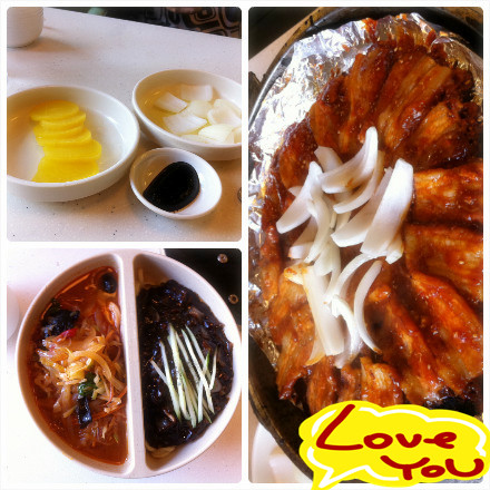 最近一直在追韩剧,看到人家吃炸酱面馋得直流口水,于是找了家口碑比较好的韩国炸酱面去解解馋,不敢说“正宗”,但绝对是我吃过的最好吃的炸酱面。点了一份烤五花肉一份炸酱面和海鲜面的双拼,都是韩剧里出镜率很高的菜哦。 ![]() 炸酱面的面条很劲道,貌似是手擀面,酱是那种韩国超市卖的韩国炸酱,酱汁里配着洋葱、土豆和肉末,大概是炖过了吧,所以吃的时候根本分不出,味道很鲜美,很想知道这是怎么炒出来的酱料。辣海鲜汤面,味道有点像辛辣面,里面的料有鱿鱼、洋葱、西葫芦,胡萝卜等丝儿状的,有点辣不过也很好吃。 ![]() 一份面赠送一份小菜,是萝卜和洋葱,萝卜就和寿司里卷的萝卜一样的,超市也可以买到,洋葱不辣很甜的,蘸着一小碟酱味道很不错,我很喜欢和面一起吃,每次都吃得很干净。 ![]() 接下来这个烤五花肉可是我的最爱,非常非常的好吃!!可是有的人不喜欢吃五花肉,因为五花肉有肥肉肉嘛,不过我觉得很好吃呢,肉肉裹着满满的辣酱吃起来不会很腻,而且上来以后不要着急吃,要再继续翻两面再继续烤一烤,这样烤的稍稍焦一点更好吃呢。