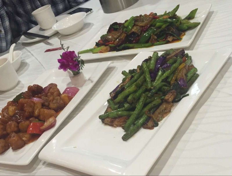今天一开餐,先是上了三道菜,一个茄子豆角、一个咕噜肉、还有一个辣椒炒回锅肉。茄子豆角是我们湖南的一道家常菜,今天这道菜做得也很不错,豆角刚刚好而且还有点脆脆的,吃起来很爽口;咕噜肉就是典型的粤菜啦,还不错,不过因为味道甜甜的,而且肉好多有点过肥了,不能多吃;再就是川菜辣椒炒回锅肉了,为什么说是川菜呢,因为它放了川菜的主要作料花椒,有点麻麻的,不过这种花椒应该是上号的,比起麻,香味更浓。