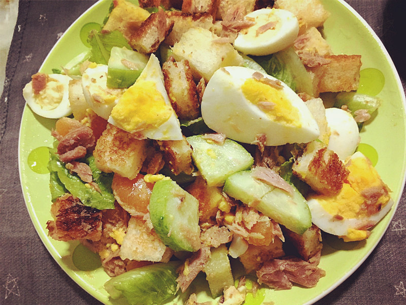 那么就介绍一两种,用金枪鱼罐头做早饭的方法。呵呵, 都是美美爱吃的,美美是吃货。 第一种,金枪鱼饭团! 材料:金枪鱼罐头,碎海苔,芝麻,少量青红椒,米饭,盐,醋 做法:1.青红椒,不用特意去买,家里平常用的青椒就可以,有那种柿子椒也可以,切成碎末,不需要很多,少量即可 2.米饭,最好是刚出锅的,热热的,搅拌后吃,还有余温。 3,如果没有芝麻,也可以换成花生米,那么需要把花生米擀碎。 4,把准备好的东西,一齐放在一起,放入少许盐和醋,搅拌即可。按照你需要的大小,揉成圆形。 5,切记,金枪鱼罐头中的油,是非常好的东西,要 带着它一起搅拌,这样更有鱼的鲜美味道。 ![]() ![]() 第二种,金枪鱼沙拉! 这个是我无意中在微博看到的美食分享。看完就让我有一种想做的冲动,感觉非常诱人。青菜的翠绿,加上各种配料的颜色,真的打动人心啊。 材料:金枪鱼罐头,生菜,熟鸡蛋,黄瓜,面包片,盐 步骤;1,面包片,需要烤制一下,如果没有那种烤箱,就用平底锅,煎一下,微黄即可,切成小正方形 2,鸡蛋煮熟,爱吃就两个,切成四等分。 3,生菜洗净,撕成小块,黄瓜切小块, 4,把准备好的东西,放入碗中,放入盐,搅拌即可(家里没有西红柿了,如果西红柿,颜色会更好)。 ![]() 其实,这个做法,特别简单,美美特别喜欢吃,里面的面包片,每次都把面包片吃光,还有金枪鱼。这个沙拉最关键的就是两种食材,一定要有,其他都可以随意搭配。最关键的就是有金枪鱼罐头和烤过的面包片。 一盒金枪鱼罐头,可以拌两次到三次,根据吃的人数量。美美爱吃,我和美美吃,一盒,两次吃光。 由于美美爱吃,那么剩下的一半,根据当时我正在做饭的情况,顺手,就给搭配了,西兰花和豌豆。美美也说非常好吃。同时还吃了青菜。真的不错。 ![]() 看着这样有营养,颜色非常舒服的沙拉,你动心了没有。也不知道我说清楚了没有,如果你也喜欢吃,那么就请动起手来吧。 本作品未经作者许可不得转载,转载请征求作者意见。擅自转载使用,将保留追究其法律责任的权利! |