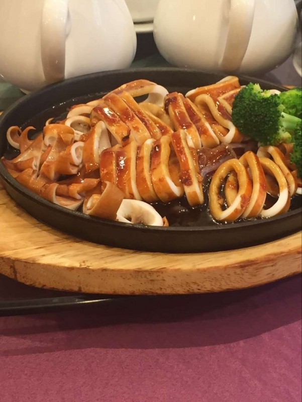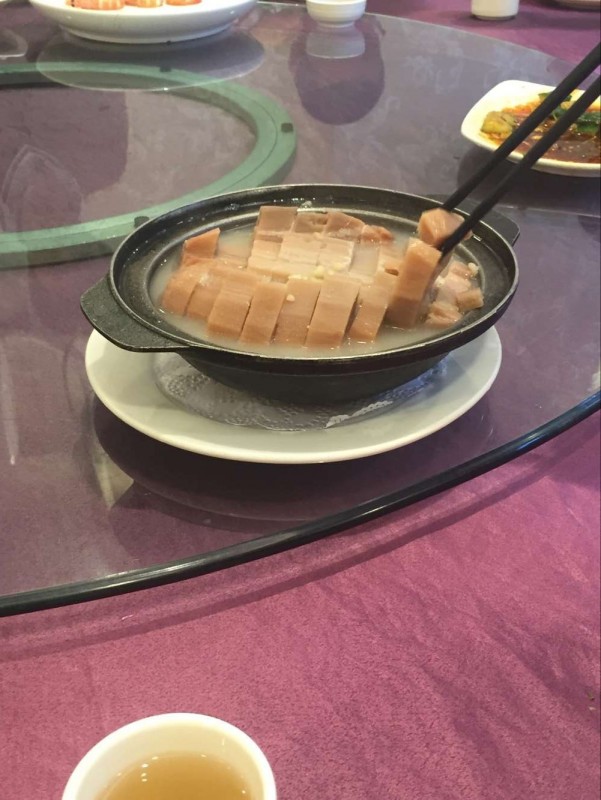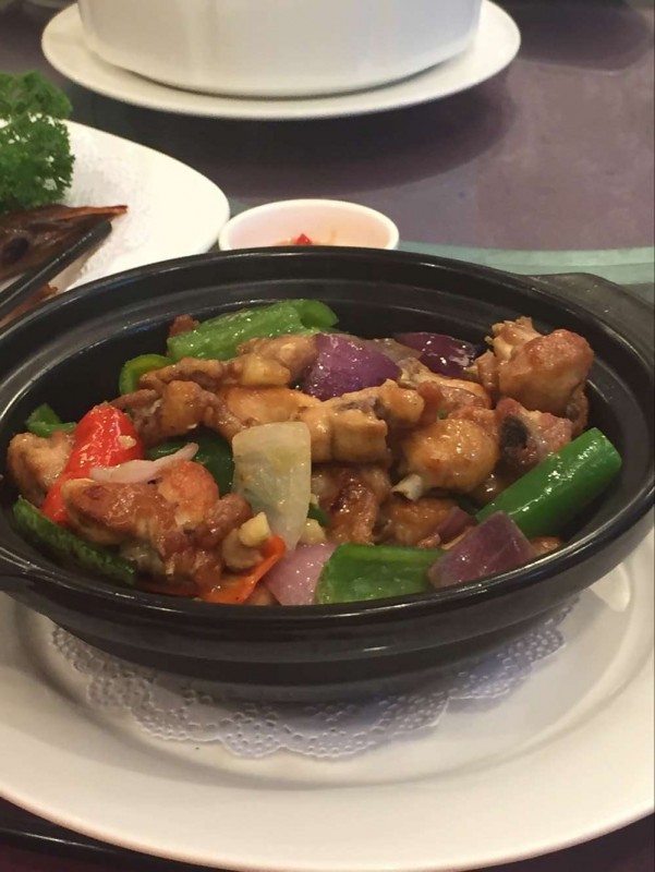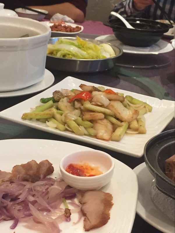 再来说说今天的菜了,这个种类就真的多了,先是上了一盘大虾,因为觉得虾可以补钙,吃的比较多,然后陆陆续续上了好多啊,不能一一的介绍了,荤菜有乳鸽、沙姜鸡、猪颈肉、铁板鱿鱼圈、客家酿豆腐、笋吵鳕鱼、炖羊肉等等;素材也有炖莲藕、上汤芥蓝、吵白菜等等,加起来差不多有十几二十到菜了吧,最后大家都吃的撑到不行,还是有剩啊,可不能浪费了不,只能分任务了。那些男孩子可惨啦,一个劲的帮他们夹菜,知道肉类差不多都吃完了,剩下的素和其他配料之类的,只能剩下了。