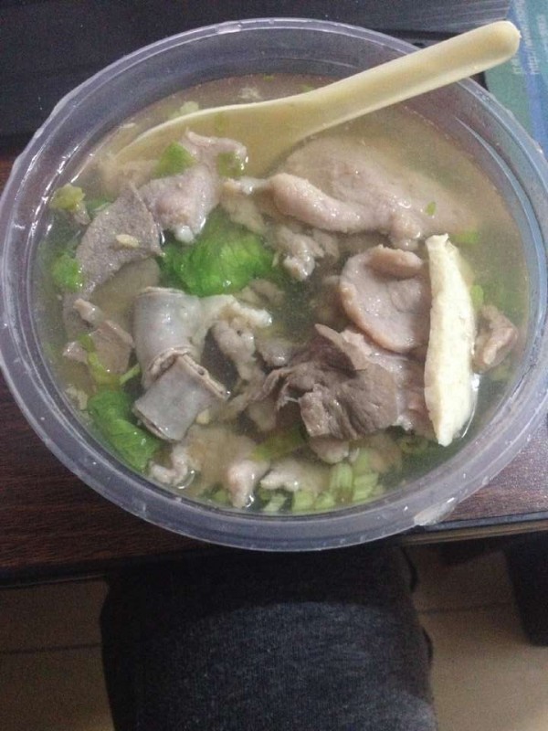 今天下班回来,因为一直在下雨,还是6点钟天色就暗暗的,也没有心情去想别的吃的了。之前就比较喜欢广州这边的猪杂汤饭,于是到楼下打包了一份汤饭就回来了,其实还挺好吃的,嘿嘿。