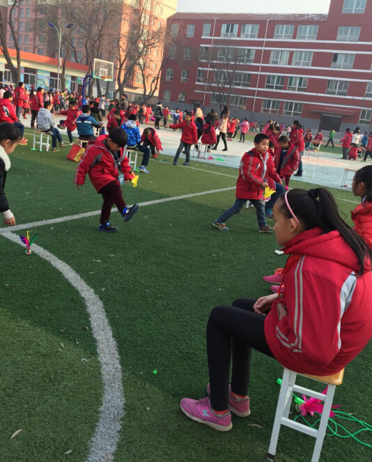 知道下午比赛我就站在阳台上开始等着看了,并 不是看的很清楚,学生们都穿一样的 校服,我 也看不到哪个是牛。只是听到念他们班上场开始,还是在极力的寻找牛的身影。高年级的同学坐在板凳上负责给比赛的数数。图片是老师当时给拍下的,还给牛拍了视频,有些同学跳的非常的 好,有些 就不行了,跳一个坏 一个。听牛回来说他跳的时候高年级的同学就没有好好的给他数,而和旁边的同学聊天了,少数了几个呢。