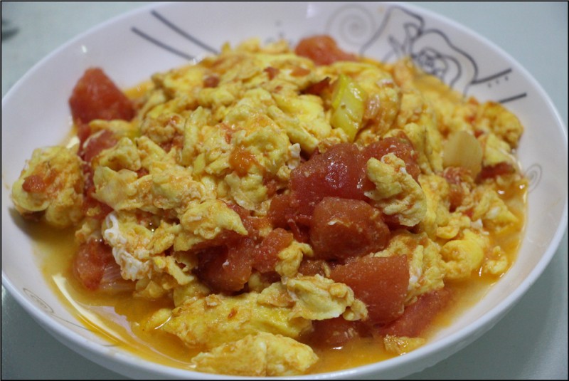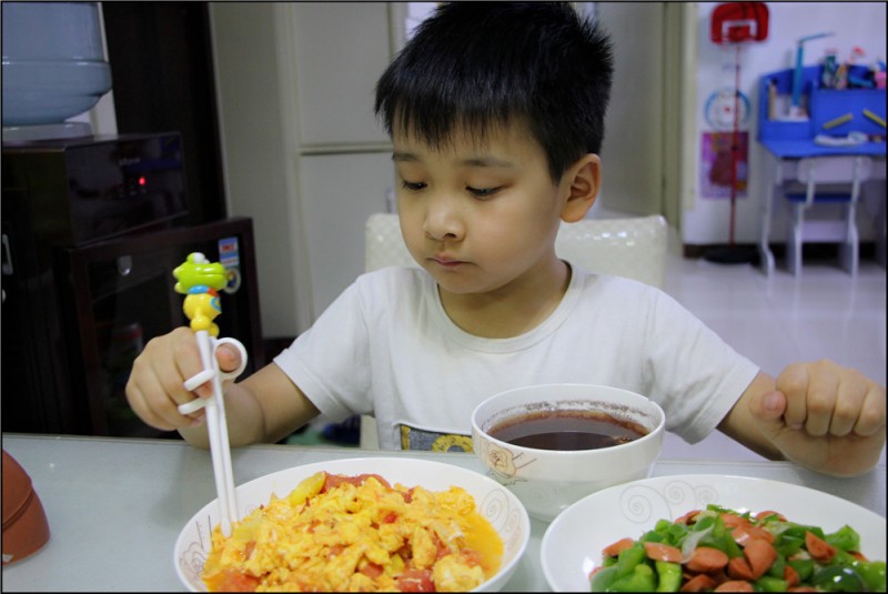 昨儿晚上又是只有我和Aric两个人吃饭,Aric本来还想等爸爸回来呢,但是当爸爸打来电话说不回家吃饭后,Aric同学还是有些小失落的。虽然窗外寒风刺骨,但是在温暖的暖气屋里,我们也脱掉了保暖内衣,只穿着短袖开始准备开吃。Aric问妈妈做了什么好吃的呢?那两眼放光的小模样好似饿了很久,我总是会有疑问,宝贝在幼儿园里三餐两点的吃着,最后一顿饭也是在下午4点钟吃完,可是回到家不到5、6点就又饿了,真真的发胖的节奏啊! 因为老公不在,我也懒得再去市场买菜,看着家里还有前一天买的蒜薹和青椒、西红柿,打算简单的做一顿饭吧。首先就是我和Aric都爱吃的西红柿炒蛋,西红柿洗净切好后备用,先把鸡蛋打散后放入油锅中翻炒到8成熟,然后盛出来。再油锅加热后翻炒西红柿,在翻炒的过程中可以适当的加一点白天去除一下酸味。接着就是放入早已经炒好备用的鸡蛋,一起翻炒后,加入适量的盐即可。不需要放鸡精哦,因为鸡蛋本身就很鲜美,而且如果要二胎是不适合吃鸡精或者味精的。