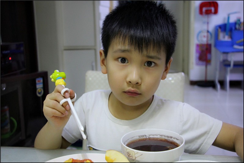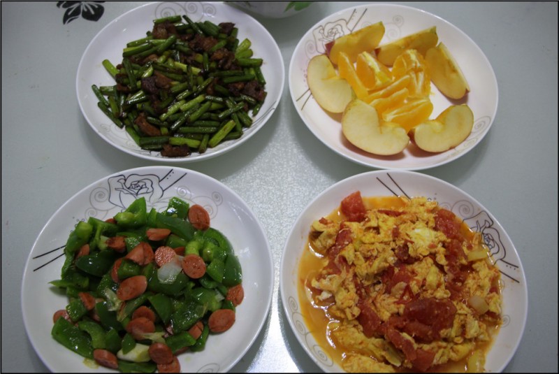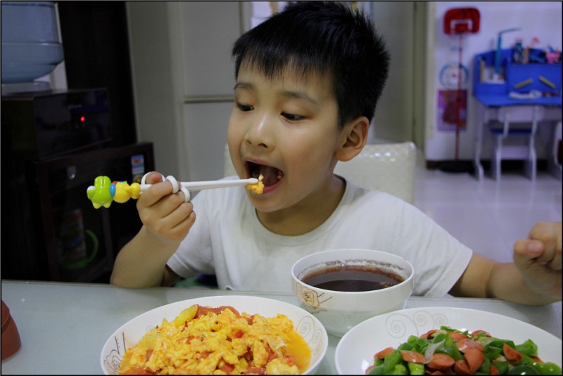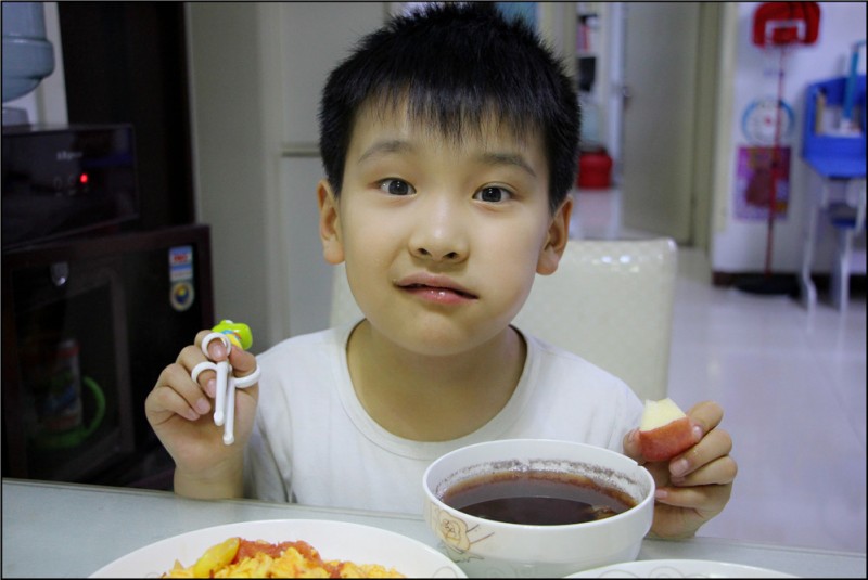 青椒炒火腿肠的做法也是很简单的,先把火腿肠切好后放入油锅中翻炒,然后加入青椒,最后再加入适量的盐即可。而蒜薹炒肉的做法也是差不多的,因为蒜薹是比较难炒的,所以需要耗费的时间也会稍微多一些,可以在炒肉的时候适当的加一些酱油,使得味道更好。如此简单的三个菜就已经炒好了,都是Aric喜欢吃的。哪怕是青椒他不敢吃,但是他可以吃一些火腿肠,有点辣味也让自己慢慢的去适应辣椒。而我炒的菜量都不是很多,毕竟只有我们两个人吃。 煮了粥,我们家每顿不是有汤就得有粥,也是山东人的习惯了。这次煮的粥是红豆红枣大米粥,补气补血,非常好喝。放了一些冰糖一起煮,红豆也煮的火候足足的。Aric喝了一大碗,直说以后要常喝。最后就是切了点水果,有苹果和橙子,都是我在TB买来的,烟台苹果赣南橙,非常好吃。等我做好了饭放在桌子上,Aric乐颠颠的关了电视跑过来坐在桌前乐不思蜀的吃起来,看来小家伙真是饿坏了啊,不过能被得到肯定,作为主厨妈妈的我来说,也是特别开心的。 ![]() 青椒炒火腿肠 ![]() 蒜薹炒肉 ![]() 西红柿炒蛋 ![]() 烟台苹果赣南橙 ![]() 简单的家常菜,吃的美美的母子俩。 ![]() 一脸诧异的模样,因为夹好的苹果竟然掉了。 ![]() 爱吃妈妈做的家常菜 ![]() 嘻嘻,宝贝吃的开心,妈妈做的也开心了。