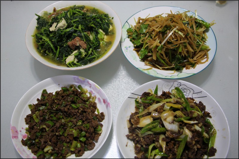 然后就是炒肉渣,就是把猪肉切成小碎粒,还有青椒也切的小小的来炒,以前我比较喜欢的是用芹菜代替青椒,但是这不是忘记买芹菜了嘛,只好用青椒来代替。Aric吃不了这道菜,实在是青椒太小了,但是老公很喜欢。山东比较有特色的主食大家都知道吧,就是煎饼,用煎饼包着我炒的肉渣,那味道杠杠的。不过今天忘记买煎饼了,嘻嘻,所以我们干脆用馒头包裹着,味道也不错。 最后就是常见的小白菜炖肉,小白菜很新鲜,老妈巧遇了下班回家的我,刚好她提了不少刚买来的小白菜问我要不要。我本来不打算要的,因为还得多做一道菜啊,可是Aric想吃,老妈就塞给我不少。回到家烫了烫,然后先炒肉再加入小白菜,再加水最后加入切好的豆腐,也是老妈给的豆腐,做成了一个小白菜豆腐炖肉。老妈还自己做了咸菜我也拿回来一盘正好凑了四个菜,哈哈,吃着主食的馒头,喝着我熬得二米粥,饱饱的一餐哦。 ![]() 猪肉和青椒炒出来的肉渣。 ![]() 老妈给拌的咸菜。 ![]() 小白菜豆腐炖肉 ![]() 孜然羊肉