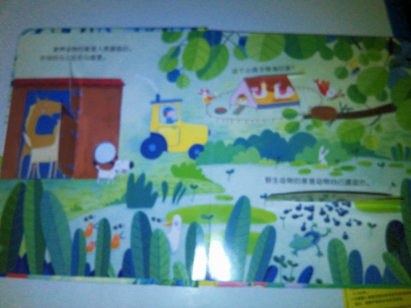 偷偷看里面,猜猜里面是什么?透过小洞能够看到里面的小兔子,儿子喜欢小兔子,看到里面的兔子急忙翻开看。翻开看到里面有各种各样的小动物,好可爱。马儿在马厩里;还有一座红色的小房子,这个小房子是谁的家?翻开一看,哇,母鸡啊!池塘里有什么呢?翻开一看,小小蝌蚪水中游,长大变小青蛙,呱呱呱,跳走啦!是不是像一首小儿歌,非常适合小宝宝。