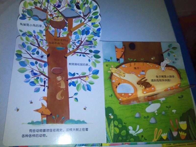有的动物喜欢住在高处,比如说大树。看到这里也可以问问宝贝,哪些动物喜欢住在树上?还有动物喜欢住在地下,小兔子的洞穴很多,狡兔三窟也可以说给宝贝听,不管这个时候能不能听懂,只要简单的告诉孩子兔子的家很多就可以了,让孩子有个基本的概念。