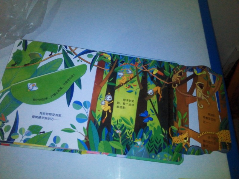 《动物的家》这本书巧妙的采用了洞洞和翻翻2种形式,很贴切宝宝的认知和生理需求,每个小洞洞和翻翻后面都隐藏这让宝宝感到惊奇的东西。儿子每次翻看的时候,都会自己配音,就是宝宝配的音我愣是没有找到这个字,真是让人无语啊,但儿子说的时候是非常开心的,每翻看一看说一次,玩的不亦乐乎,没看到一个都是非常惊喜的。看到自己认识的会很快的说出来,很有成就感,这样也很乐意玩。