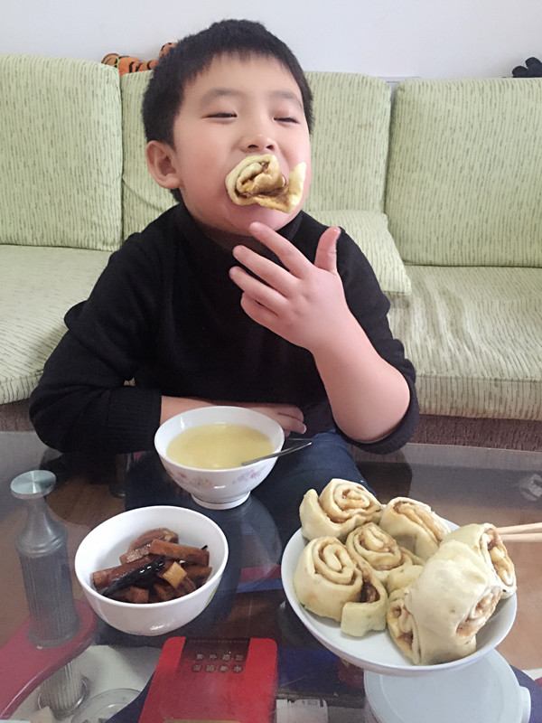 ![]() 说实在的,每天做饭是目前比较发愁的一件事,刚刚吃过早饭就和妈妈开始商量着中午做什么饭吃,需要买什么菜了。姥姥那天提议说要不吃包子吧,我一听包子经常吃,要不该吃肉卷吧,这个比包子好吃多了,并且孩子们也爱吃,当然包子也爱吃。凡事带馅的美食我们家娃都爱吃,吃货嘛。 ![]() 于是开始和姥姥做肉卷, 面是姥姥 已经发来的,发了那么 一大盆,可以蒸不少肉卷了。肉卷我们家通常都是纯肉的,里面不添加任何的蔬菜,这样的肉卷做出来当然就更香了,绝对是满嘴冒油的节奏。拿出肉馅放各种调味品,我们全家人都喜欢吃妈妈调制的 饺子馅,包子馅,别看妹夫是大饭店的面点大师傅,可他调制的馅的味道我们就感觉不如妈妈做的好,外甥通常听到我们这么说他爸爸,马上就说我爸做的最香,我爸可是大师傅呢!哈哈!这儿子没白养啊,绝对站在自己老爸一边。我调制的就不如妈妈的香,调味是放的一样,可味道出来就是不一样。 很快肉馅就调好了,放到 一边 待用,然后开始和面。把 面团擀成一个圆形的大饼状,然后把肉馅抹着上面。妈妈比我还舍得给自己的外孙吃,那个肉馅放的叫一个多,厚厚的铺了一层。我说这样不行,太厚了,有薄薄的一层就可以了。我又开始告诉妈妈这个地方需要去掉一些,那个地方 也需要去掉一些, 妈妈说再去就不香了。我说就这么吃下去能瘦了就奇怪了,这下减肥有点靠后站了。 ![]() 面饼上均匀的抹开后就可以朝着一个方向卷起来了,卷成一个长条,然后根据自己的喜好切成 小块,妈妈把两头的部分拧在 一起做成了花卷形状。这样就可以上锅蒸了。。。。。。 ![]() 蒸汽冒出来后满家飘的都是肉香味,真的太香了! 时间到香喷喷的肉卷出锅了,热乎乎的先吃上 一个满足一些嘴巴,然后装盘,等牛一进家门也闻到了肉卷的香味,看着一盘子的肉卷第一个想到的就是问我 ,妈妈我可以吃几个呀? 我说最多吃上4个吧。牛一听马上长大嘴巴来了一句啊?刚能吃4个?汤我给熬了玉米糊糊,这样的主食来点粗粮做搭配感觉不错,牛也特别喜欢喝玉米糊糊,再来点自己 腌制的苤蓝咸菜,简单却美味的午餐 。 看看牛的吃相,等我坐下来吃的时候牛已经6个下肚了,两碗玉米糊糊也仅剩下一个碗底了,一个没看住就这样让牛多吃了2个。美办法谁让这肉卷这么香来着,给谁 也抵挡不住啊!!