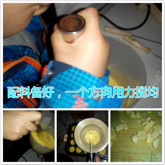 星期五晚上,终于孩子们一个个放学回家了,到笑笑姐姐家集合,开始做美味的章鱼小丸子。 三个孩子先洗手后就分配任务,笑笑姐是主厨,豆豆姐姐负责烤盘烤制,小弟小宝打杂。 章鱼小丸子开工,笑笑姐按比例配好章鱼烧粉和鸡蛋,切白菜碎加入面酱中,火腿碎待用;小弟小宝来搅拌,大约五分钟后,豆豆姐预热烤盘,两姐姐开始滴油。