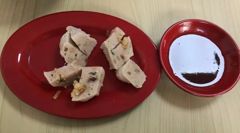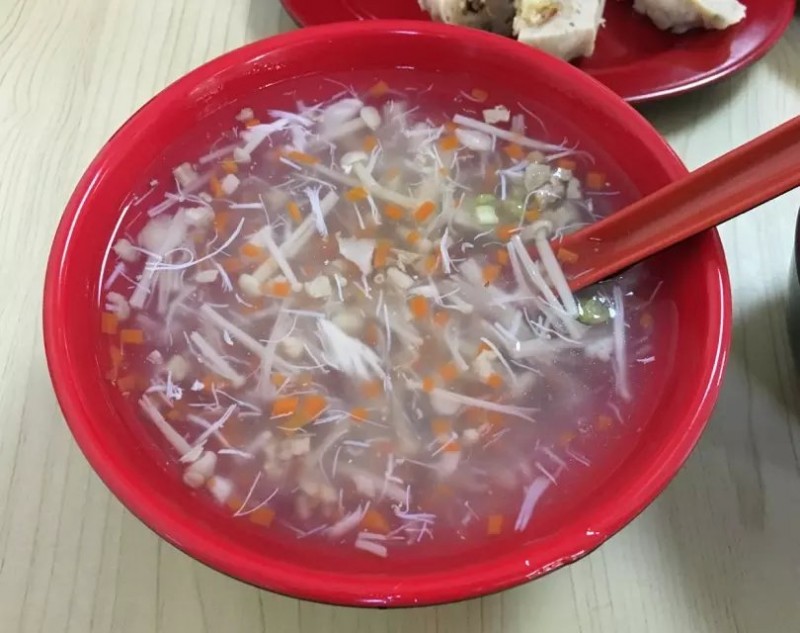 这家店面很大,也许我们来得晚了,食客只有廖廖几个。看了一下菜单,也不全是深沪小吃,还有其他面食、汤类,算是混合型了。我本想点一份马蛟羹,看了一下价格还不便宜啊,8元一碗。记得之前一直是5元一碗啊,涨得很快!就换了口味——螃蟹羹,听起来很有诱惑的海鲜汤,说是加了金针菇、蟹肉、猪肉一起煮的,一份6元还能接受。再点了份小份壶仔饭加一盘拳头母。同事则点了一份牛肉羹、一份炒米粉。很快菜就齐了!汤羹不是很热,炒米粉也不是现炒的,都是煮好了的,壶仔饭则是从一个白色小壶倒扣出来的,加了猪肉、香菇、花生米一起。