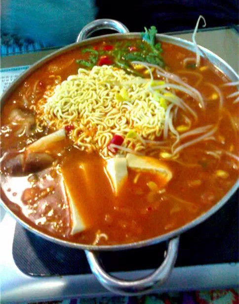 近几年韩剧火了又火,韩餐也随之爆红,现在韩国烤肉、韩国炸鸡、年糕火锅满大街都是。我对这些韩餐还是蛮喜欢的,前段时间吃了一次部队锅,至今念念不忘。 部队锅是韩国的一种火锅,关于部队锅,在百度上能找到好多种版本的来源。反正,部队锅肯定跟部队有关,就是将火腿肠、午餐肉等肉类,洋葱、茼蒿等蔬菜类,金针菇等菌类连同年糕片、泡菜、豆腐、芽菜、拉面等食材全部放入锅中,加入辣椒酱,再加入高汤或水一起炖煮。冷冷的冬天里用电磁炉煮一锅热气腾腾的部队锅,看着就很温暖的感觉。