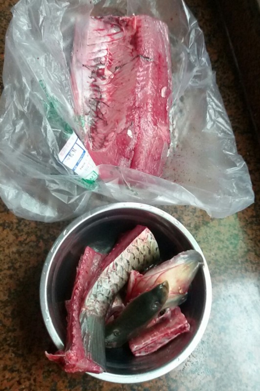 正当我在准备放弃买整条鲩鱼的时候,我看到一位背着宝宝的阿姨驻留在水缸旁边,看上去好像也准备买鱼,于是我就问她是不是想买鲩鱼,然后她就点头说是,于是我就建议:不如买整条鲩鱼,我们一人一半。那位阿姨听了也觉得主意不错。于是她就开始挑鱼了,不一会儿她就挑了一条看上去精神很好不大不小的鲩鱼。 档主去了鱼鳞后就开始称重了,然后细心地把我们把鲩鱼一分为半,分的时候阿姨叫档主分得均匀一些,比如鱼尾要一人一半,鱼骨也要一人一半。档主听了后也觉得阿姨太挑剔了,其实我也是这样认为的,因为多一点少一点我也无所谓,重量差不多就行了,没必要分得那么细。
