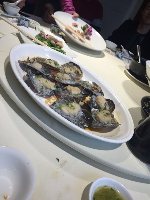 不过我也只是吃了这一块而已,不是因为这个水煮鱼很辣,其实我觉得它辣味倒是不浓,但是花椒放的特别的多,我夹的时候粘在鱼片上都有好多的花椒,挑了好久才挑干净,而且即使把花椒挑了,这个鱼片还是特别的麻。都说孕期还是不要吃花椒的好,我原本也只是想要尝一下而已,结果发现自己还是受不了这样的麻,花椒的味道太重了。我就夹了这一块,后来用同样的碗吃别的的时候都还觉得沾有这个花椒的味道,还换了一个碗呢。 上了这个水煮鱼之后,服务员又立刻端上来一盘贝类,天哪,又是大大的一盘。敢情之前上来的菜都是小菜了,这个时候才是上真正的荤菜,可是大家都已经吃得差不多了呢。还好这个贝类只是体积比较大,每个人其实只有一个,不然大家估计都没有战斗力了吧。这个上菜的顺序真的是让我醉醉的,哪有把这些菜都放在最后面上的,这个一般人肯定都是吃不下的啊。 最后通过大家的努力,还是没有把这两个菜消灭掉,水煮鱼还剩下好多呢,大家也都已经吃不下了,又不能这么浪费了嘛,只能是打包回去再吃了。
