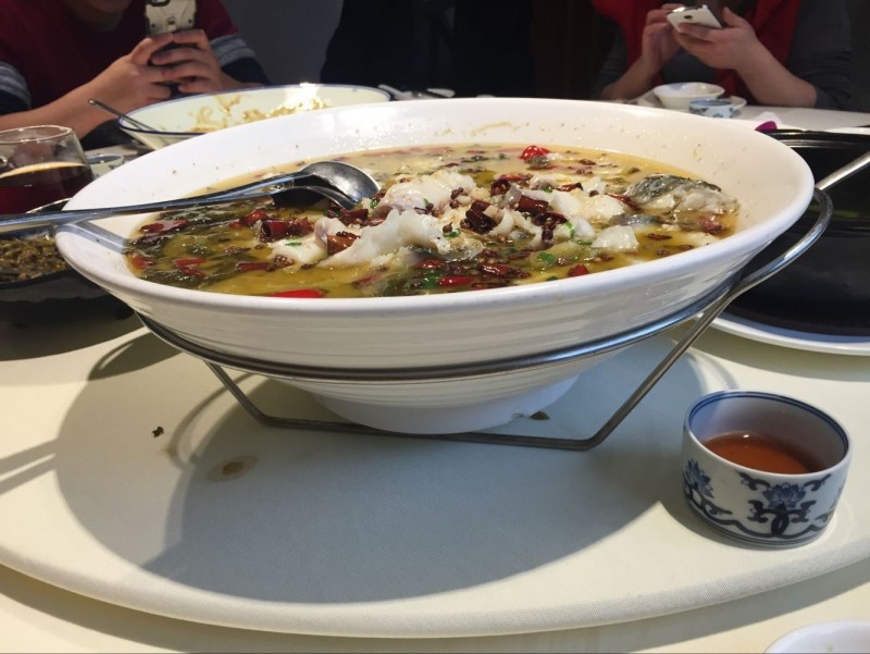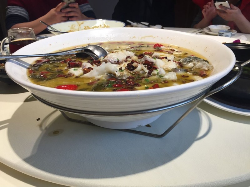 后来等我们把一大盘娃窝窝头快吃完的时候,服务员竟然端了一大盘水煮鱼上来,这可是吓到我们了呢。这个时候其实大家都已经吃得差不多了,米饭都已经吃完了,应该都应该到了八九分饱了吧。这个时候上来那么大一盘水煮鱼,我们都觉得很是惊讶呢,连点菜的经理都吃了一惊,她已经压根就忘了点了这么一个菜了。