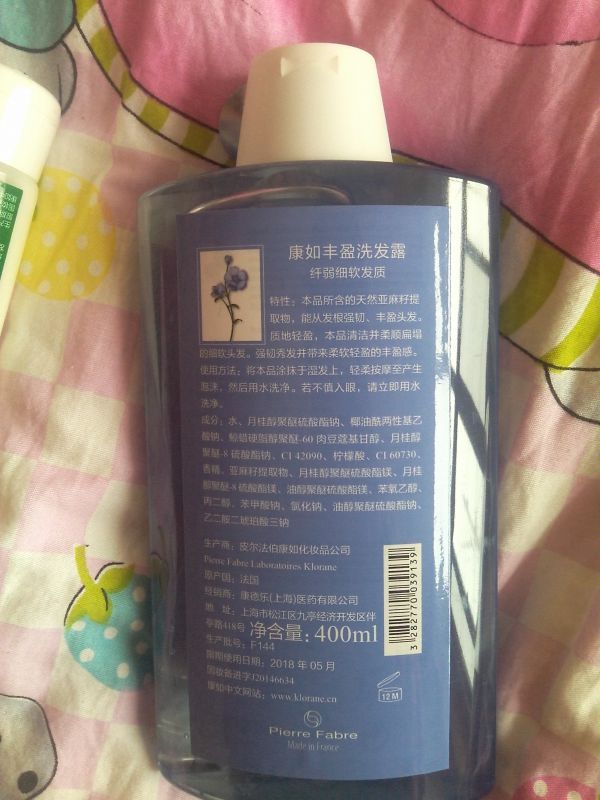 这款洗发露400ml,还是挺多的,就我各人觉得一般送的东西都是很少的,一般都是小样吧,没想到会有400这么多,真是惊喜。而且就这一瓶洗发露居然标价128元,免费试用的有一万份,真是舍得啊。不知道是不是法国的,上面的文字表示不认识,我只认识背面的中文,嘿嘿。。。而且到2018年才会过期,可以放心大胆的用啦,日期还是很新的。至于护发素只有50ml,算是赠送的,但即使如此,也还是有防伪标志的。