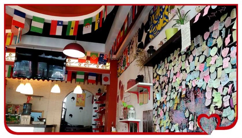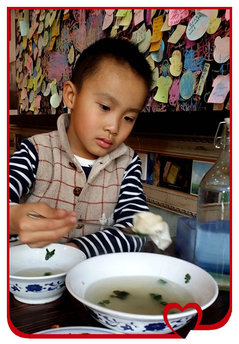 前几天接到宝贝钢琴社团老师的电话,说是本周五是钢琴社团的最后一堂课了,孩子们将进行汇报演出,希望家长有时间带着孩子来练习练习,老师给看看指点下。当时和老师把时间约在了星期四,可是考虑放学后就要学习跆拳道,所以打算中午吃完饭就带小家伙去琴行练习一下。因为中午时间比较紧张,索性就不带孩子回家吃了,干脆在外面解决了,话说宝贝最近时间在外吃饭的次数并不多呢,当妈妈中午接了小家伙告知要在外面吃饭的时候,孩子好开心。 学校周边有不少解决吃饭的地方,妈妈征求宝贝意见是去红太阳喝粥,还是古城吃包子。小家伙摇摇头说道:“我想吃馄饨”,哦,刚好看到古城包子店面前的宣传板上有馄饨的照片,干脆就去这里好了,距离练琴的地方也近。来到古城包子店里,好像只有我们两人吃饭,因为放学就来了,属于吃饭时间比较早的吧,后来当我们吃到一半的时候店内就已经坐满了。这家古城包子的装修还挺有特色的,屋顶悬挂的各个国家的旗子,还有墙面上贴满了好多即时贴留下的字条,另外每个桌子上都有一个笔记本,供客人留言使用,贴心的设计让人暖心呢。