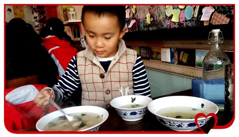点了两盘小菜,妈妈要了一碗小米粥和包子,宝贝来了碗鲜肉的馄饨,很清淡也算是有滋味的午餐吧。装馄饨的碗非常的大,妈妈还特意给小家伙要了一个小碗来分开吃,这样凉的快。不知道是这里的馄饨太好吃,还是小家伙的胃口超级好,反正当宝贝第一碗馄饨快吃完的时候居然说道么有吃饱,妈妈让小家伙吃点包子吧,结果臭小子说的是还想再吃一碗馄饨。妈妈真是挺吃惊的,这一碗馄饨是12个,两碗就是24个啊,不知道小家伙这是咋的了,胃口大开的感觉。于是乎在来一碗鲜肉馄饨吧。