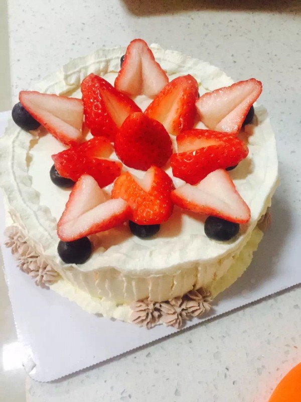 第三天做的草莓蛋糕,在蛋糕上面摆满了草莓,这个草莓还是有造型的,是两个五角星的造型,草莓切开了摆在蛋糕的表面,很漂亮的造型。
