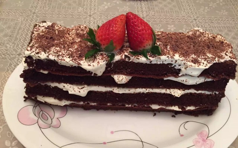 第一天做的巧克力蛋糕,在蛋糕上面是巧克力,中间还有夹心水果和巧克力酱,一看上去就很好吃呢,让人垂涎欲滴啊。