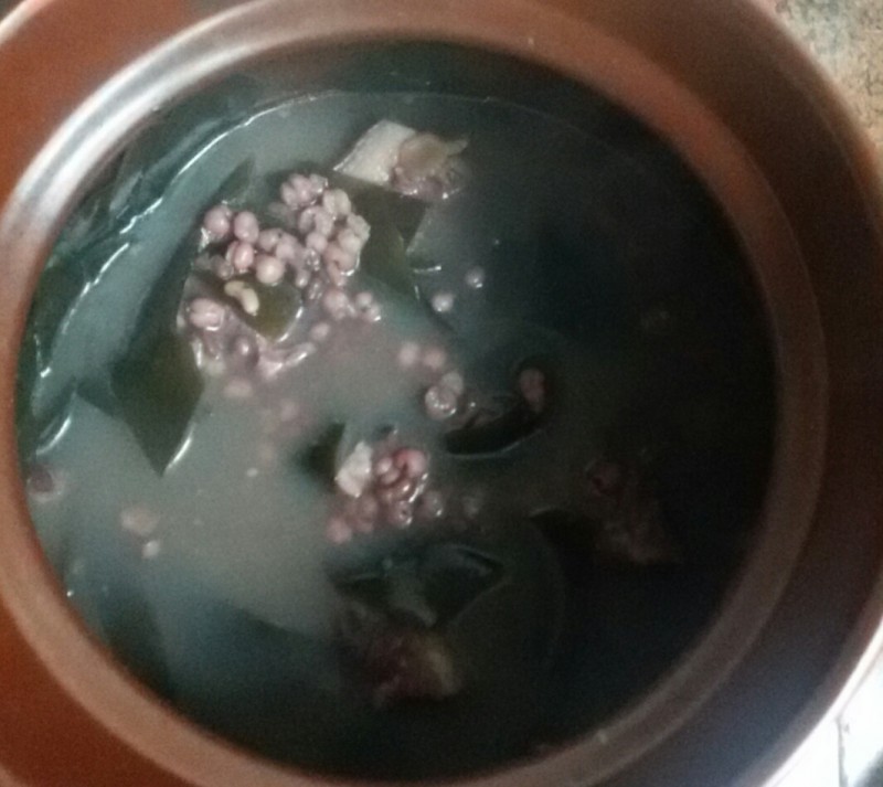 材料准备:猪尾骨一条(约500克),赤小豆50克,薏米60克,海带30克,生姜三片,红枣6枚,龙眼肉适量 步骤: 1、 赤小豆、薏米洗净,然后用清水浸泡半小时以上,捞起,备用; 2、 海带浸泡半个小时以上,然后再用清水清洗干净,捞起切小块,备用; 3、 因为海带有点寒,所以这次的红枣洗净后,不用去核,备用; 4、 猪尾骨洗净,然后放入锅中的开水飞一下水,飞至变色即可盛起,备用; 5、 砂锅洗净,把泡好的赤小豆、薏米、海带、红枣、生姜和猪尾骨一同放入锅内,然后加足量的清水大火煮,煮开以后改为小火煲一个半小时即可关火; 6、 加入适量的盐调味即可饮汤食汤料。