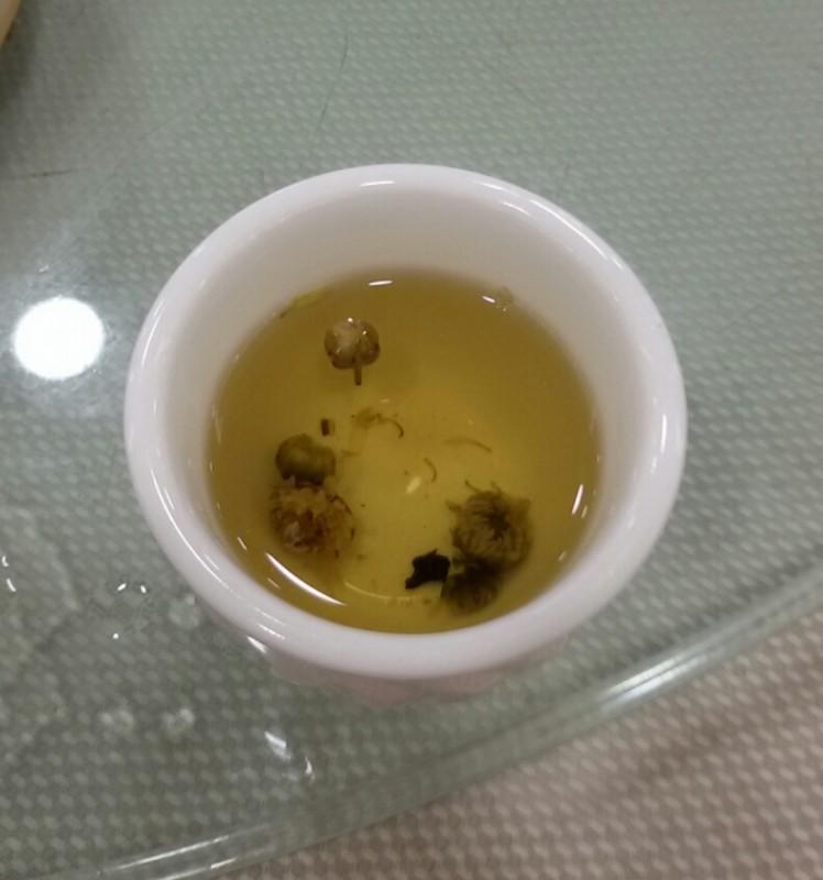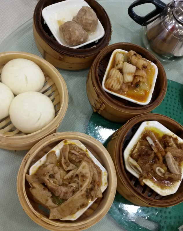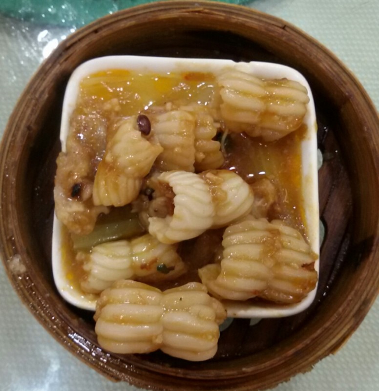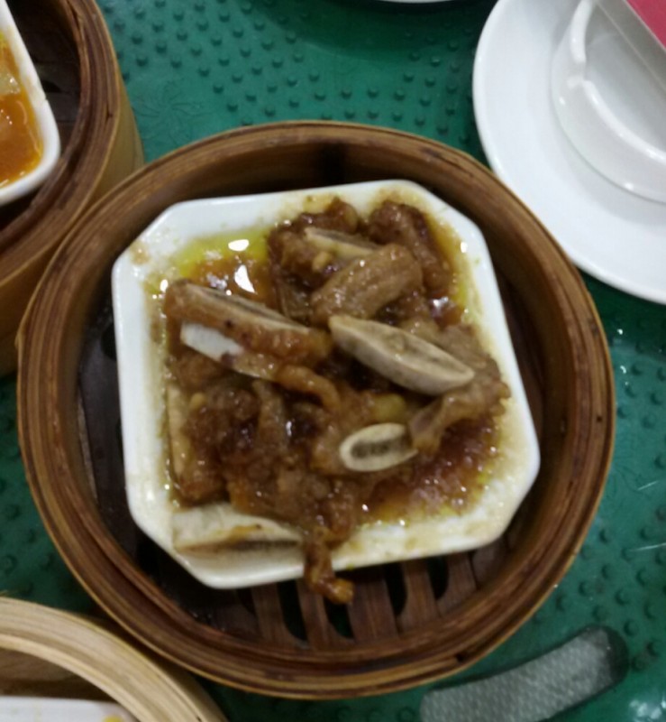 知道我和小不点最近喜欢喝菊花茶,所以宝爸在点茶时就要了一壶菊花茶。虽然那里的茶位也蛮贵的(28元/位)环境也不错,但我觉得这茶楼的菊花茶没有朋友家的菊花茶好喝,泡出来的茶也没有那么好看。 喝了几口茶后,我们就点了几个点心,有肉包,马蹄猪肉丸、牛仔排、猪七寸和猪天梯。 因为猪七寸和牛仔排(香芋除外)都有点辣味,所以小不点一口都没有吃,只吃肉包和马蹄猪肉丸。 其实,在这几个点心中,我最喜欢吃的就是猪七寸了,刚开始时我还以为它是猪肚呢,还因为这个被宝爸取笑了一番呢。 除此之外,我也喜欢吃猪天梯。老实说,我真不知道猪天梯是猪的哪个部分,只知道它口感非常棒,吃起来脆脆的,小不点也喜欢吃这个呢。回家以后我还是百度了一下,才知道猪天梯就是猪上颚带鼻子的那块。另外,猪天梯下面也垫了点蔬菜,可惜垫的是我和小不点都不喜欢吃的芹菜。