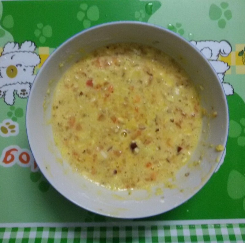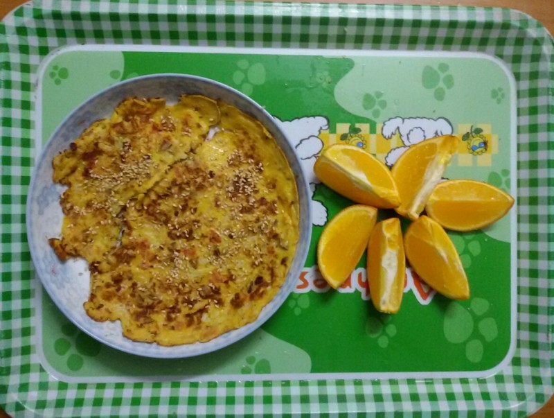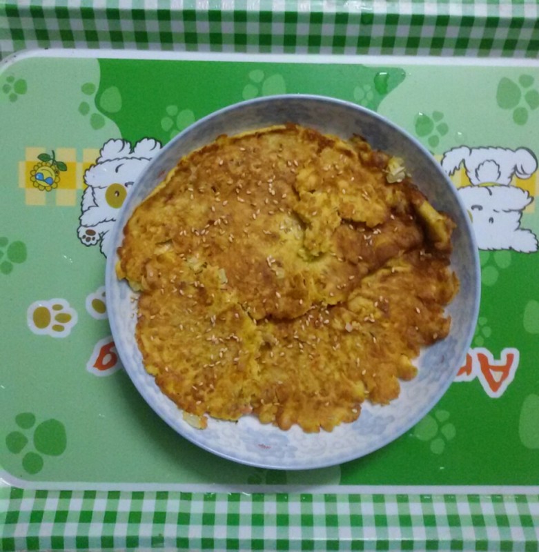 步骤: 1、 大白菜洗净切碎,备用;番茄去皮,取一半切小块,备用;红枣去核切细末,备用; 2、 鸡蛋去壳,把鸡蛋液装在碗里,然后打散,然后加入步骤1所有的材料、面粉和盐一起搅匀,备用; 3、 不粘锅烧热,加入适量的花生油,然后把碗里一半的浆液倒入不粘锅内,然后调为中火,待其变色后调成慢火继续煎,煎熟一面后把它翻到另一面继续煎,煎熟后即可关火起锅。 4、 把炒熟的白芝麻洒到煎饼上面即可切开食用。