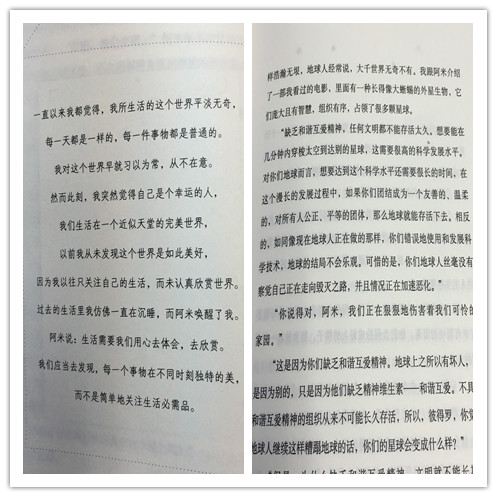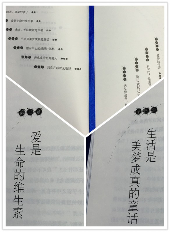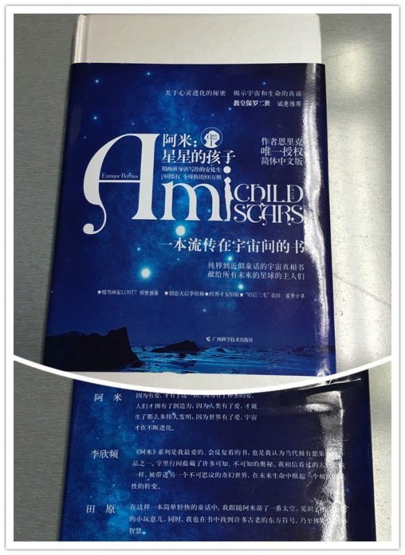 在地带阅读分享群有幸获得的这本《阿米:星星的孩子》,是我的第一本心灵读物,之前都是从各种论坛或者朋友圈看别人发的心灵鸡汤,自己也忍不住转发过来以时刻警醒自己、勉励自己,现在手捧这本爱书,要好好欣赏一番。 这本书很特别,以蓝色为主色调,内有有趣的插画;内容很丰富,足足247页,适合闲暇时静静的欣赏。由广西科学技术出版社出版,是一本流传在宇宙间的书,获得13国版权,已热销500万册,获得不少名人才子的盛赞,值得大家拥有。 我想把它比作一部科幻片,因为里面确实出现了飞船,出现了外星人。让我想起了《变形金刚》,为了世界和平,外星人来到地球寻求合作。要将先进的思想引入到地球,让大家摈弃邪恶,放弃战争,一起创造更好的生活环境。为了共同的梦想,大家携手奋斗。 我想把它比作一部动画片,因为里面有孩子们喜欢的故事和场景。阿米的穿着、阿米的样貌和动画片如出一辙,阿米是个老小孩,一肚子的哲理,每集故事都会告诉孩子们大道理,教他们如何更好地融入社会,如何与人相处,与人为善。阿米带着孩子遨游太空,探索更多的未知,学到更多的知识。孩子在成长的过程中,可以一直得到这样的熏陶,无需动之以情晓之以理,就可以顺其自然地懂得人生。 我还想把它视作一位好朋友,在我无聊的时候,我可以拿出来读一读;在我悲伤的时候,可以学学阿米的乐观;在我愤怒的时候,可以教我冷静处事。这是一位老友,不管我年龄多大,身处何方,可以一直陪伴我,因为他的思想永不过时,祖祖辈辈都可以传承下去,是先进的思想,是世界大同的思想。 这是一本传递大爱的著作。当所有人都以爱为先,这个世界将会大不同。心中充满爱,就会减少邪恶,减少杀戮,换来的是和平,是永恒。书中蕴藏了许多不可知的奥秘,看过的人都会感觉被带进了另一个奇妙的世界,在那里,我们会自然的放松自己,卸下身上的包袱,静静地聆听,和谐地生活。 这样的一本心灵鸡汤,捧在手中真是如获至宝,感谢地带给予的机会,感谢出版社的赠书,让我获益良多。不仅在我的手中,我也会让身边的人都来读一读,让他发光发热,更大的发挥他的价值。