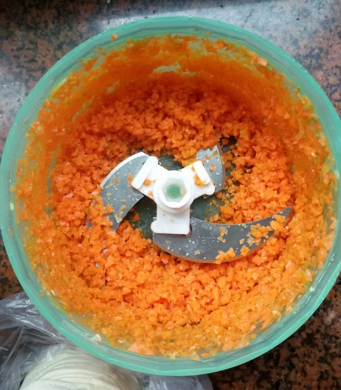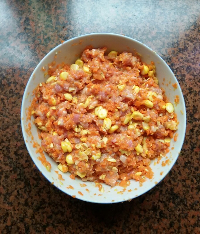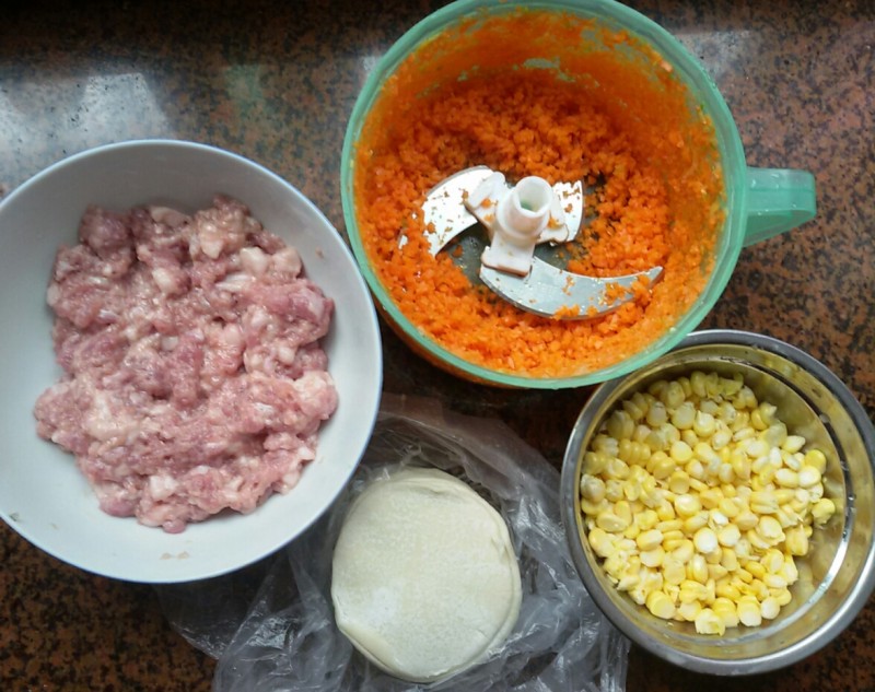 材料准备: 胡萝卜半根(100克)、玉米半根(100克)、猪上肉(250克)、葱花适量、饺子皮适量 步骤: 1、 胡萝卜去皮,切块,然后放到料理器里打碎,备用; 2、 玉米洗净,取玉米粒,备用; 3、 虽然我们家的多功能料理器可以把猪肉绞得很碎,但由于我的力气不是很大,手摇起来会特别累,而且很吃力的感觉,所以我还是喜欢用菜刀把猪肉剁碎,这样吃起来更有滑。猪肉剁好后即可加入适量的盐、生粉、花生油、胡椒粉和蚝油调味,然后再加入胡萝卜末、玉米粒、葱花一起拌匀,备用; 4、 因为我自己不会做饺子皮,所以包饺子的时候都是从外面买回来的,昨天我本来是想要买薄的饺子皮来包饺子的,哪想到老板娘给我拿了厚的饺子皮。幸好宝爸特别会做煎饺子,所以并不影响饺子的口味。