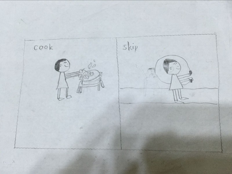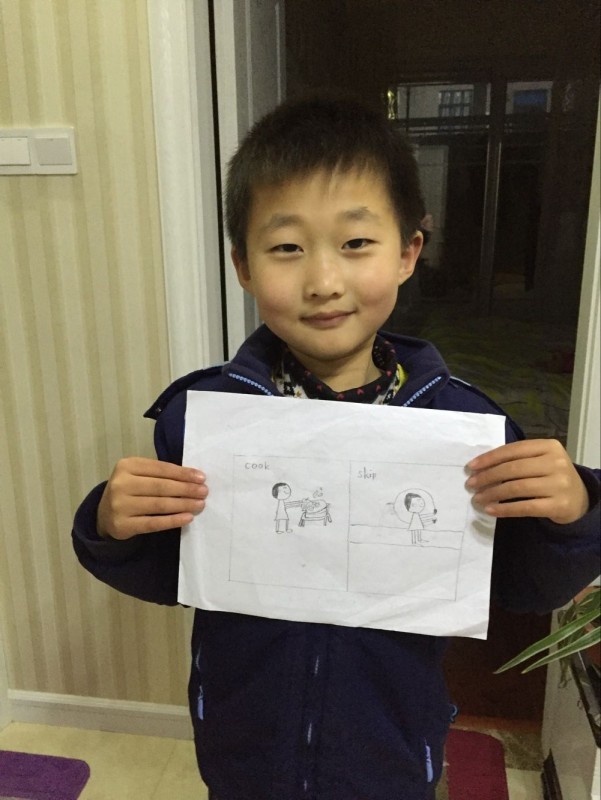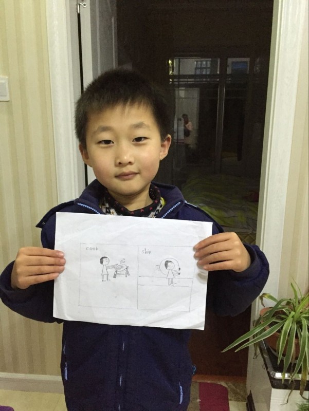晚上,点点回来以后,点点就把自己画的英语海报给我看,我一看,就画了两个小孩,一个是小孩在烧饭cook,一个是小孩在跳绳skip,这是点点最喜欢做的事情,点点说这就是后来画的海报,原来英语海报是这样的呢,点点说一开始画唱歌不会画,后来就改成跳绳了,比较好画一些。我觉得烧饭和跳绳画起来还是有些难度的,点点可以凭借自己的想象力画出来还是很不错的。