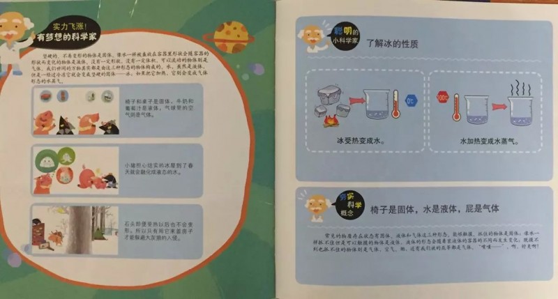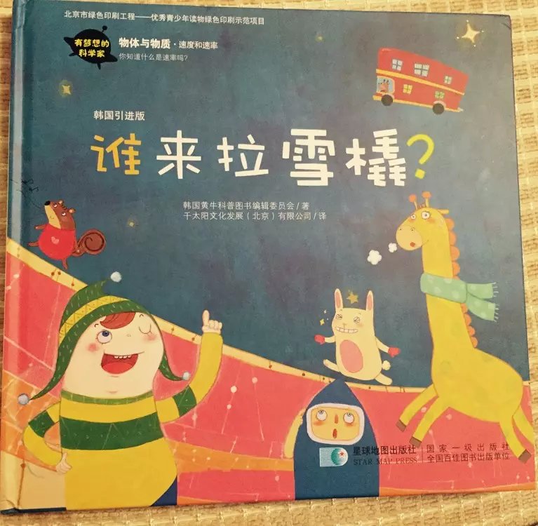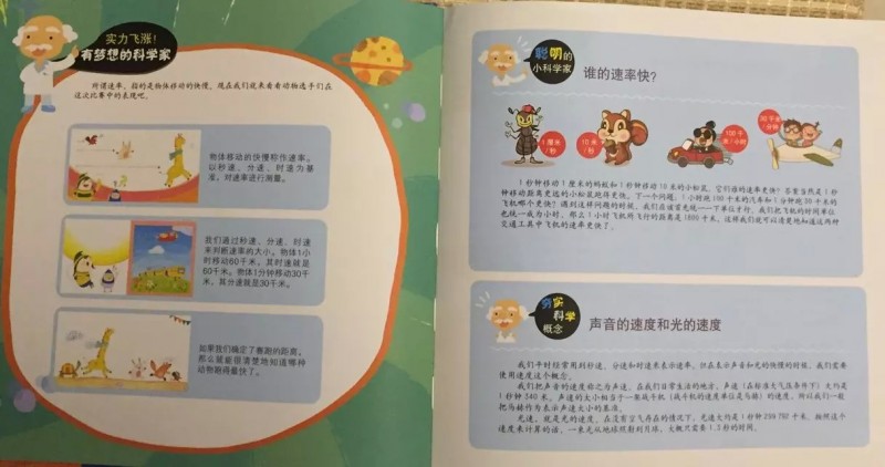 这套《有梦想的科学家》全部采用精装印刷,每一本其实收纳了两本书的内容。你正着拿的时候看着明明是一本书,一个故事和一个科学主题。而反过来倒着拿又是另外一本书,另外一个故事和科学主题。这么说确实有点绕嘴,我还是上图吧。 ![]() ![]() 怎么样,有没有被震惊到?再看看内图。 ![]() ![]() 童话故事和插画都非常美丽,非常吸引小朋友。《谁来拉雪橇》讲的是为圣诞老人拉雪橇的驯鹿鲁道夫的腿受伤了,春夏秋冬四个小精灵开始张贴告示,寻找能为圣诞老人拉雪橇送圣诞礼物的小动物。比赛的目的就是要找出既能够负重又跑得快的小动物。最后长颈鹿脱颖而出成为冠军。但是结局却出乎所有人的意外,原来圣诞老人换了新的工具——飞天汽车。哈哈,鲁道夫腿受伤了,但是不影响开车。真是非常有意思的故事。在故事中,非常自然而然地阐述了速率这个概念,小朋友们也非常容易理解和接受。 ![]() 《冰屋和大灰狼》讲的是经典的大灰狼和小猪的故事的续集。在这个有趣的故事中,让小朋友们轻松认知到水的三种状态:固体、液体和气体。在说到放的屁属于气体时,小家伙乐得哈哈大笑。 ![]() ![]() 每一个故事后面都有一个科普小总结和知识拓展。激发孩子对科学的求知欲和对生活、自然现象的探索欲望。 ![]() ![]() 怎么样,看过介绍你是不是也爱上了这本书呢?真的是集趣味与知识性并重的科谱童话书呢。 本作品未经作者许可不得转载,转载请征求作者意见。擅自转载使用,将保留追究其法律责任的权利! 个性签名