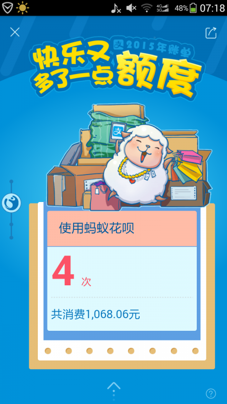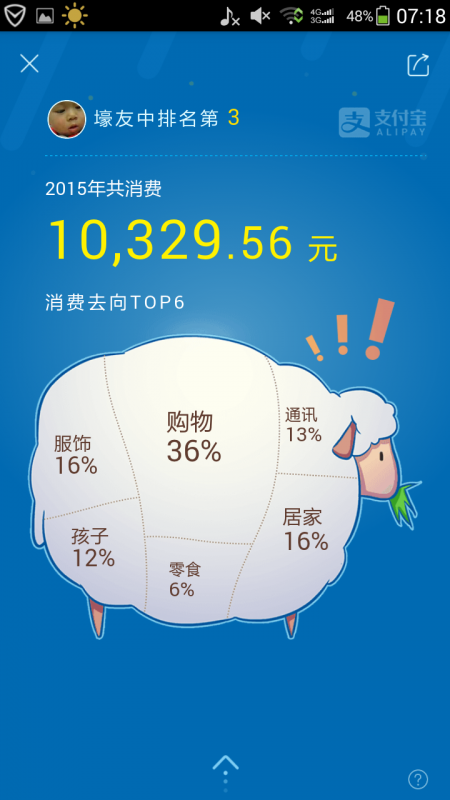 自己2015年的支付宝账单出来了,看到之后自己吓了一跳,居然超过了一万,我都没觉得自己会花这么多钱,而且有4次是使用了蚂蚁花呗,想想自己真不是个容易控制的人啊。记得当知道有信用卡这东西的时候,我曾经是非常的心动的,可以预支消费,多好。可是后来又想着自己估计用到的地方比较少,才没有去办的,现在想想还好没有去办。