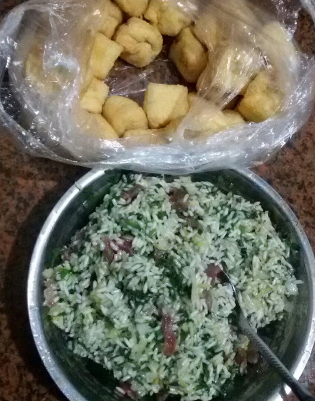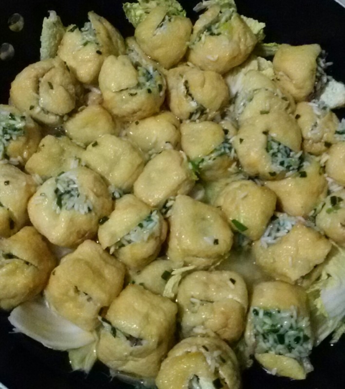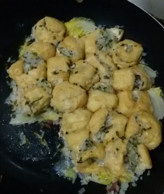 1、只见他先把韮菜和娃娃菜洗干净,然后用手去撕娃娃菜,撕成不规则的一片片,然后再把韮菜切小段,然后再把洗干净的腊肠切成小片。 2、接下来,我就看到他把糯米沥干,然后把铁锅洗干净,然后往锅里加入适量的花生油,然后把沥干的糯米放到锅里炒,炒了一会儿后又加入韮菜、腊肠和盐一起炒,然后关火用盘子盛起来晾凉。 3、剪刀洗干净,然后在油豆腐最上面剪一小口,算是为油豆腐打开一个小盖子,宝爸在我面前示范了一下后就让我来做这个工作了。然后他就开始往油豆腐里塞糯米馅了。 4、好不容易塞完后,宝爸就把不粘锅洗干净,然后把娃娃菜放在锅底里,然后再把酿好的油豆腐一个个地摆在娃娃菜上面,然后再加入适量的水就开火煮了,这个时候最好用大火煮,等水煮开以后就改为中小火,这样才不会粘锅,而且糯米也能煮透。 5、半小时后糯米酿油豆腐煮熟了,然后我们就当饭吃了。实话说,这菜式我还是第一次吃,想不到味道还不错,有点像腊八饭的味道。