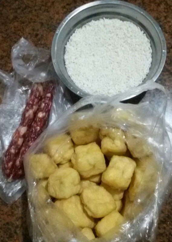 我们这里昨天下了一整天的雨,所以我和小不点都宅在家里。正当我在考虑愁晚饭没菜吃的时候,宝爸却突然出差回来了,还买了准备做晚饭的菜呢。 我接过来打开一看才知道他买了一袋糯米,一袋油豆腐,一棵娃娃菜,一小撮韮菜和两条腊肠。我问他为什么买糯米,然后他就说用来酿油豆腐。我听他这样一说,我就知道韮菜和腊肠是和糯米一起酿油豆腐的了。至于大白娃娃菜,我就猜测是放在锅底里垫底和煮糯米酿油豆腐的。 果不出我所料,宝爸就是想这样做的。因为他有电话要聊,所以他就叫我帮他提前用清水浸泡糯米。由于我不知道要用多少的糯米酿油豆腐,所以我就直接放用来煮米饭一样多的糯米了。