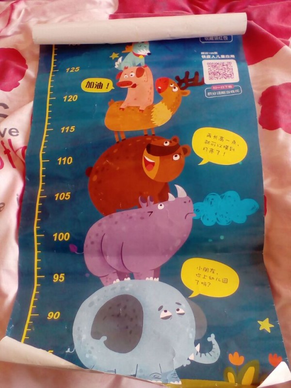 天亮后老师说让我再拍一个身高贴,超过58元,她才好改价,因为分享我中了一本《小鳄鱼牙牙》,就请老师发一本别的,可惜书都是包装的好好的,没办法拆开,后来减免了2.5元,最终50.5元拍下了3套书和身高贴,本来身高贴就卖9.5元啊,直接是白送给我了,很是感谢。等了几天收到书,儿子看到这么多书很是开心,而且对身高贴上面的小动物也是很感兴趣的,自己指着在那说这是大象,那是小猫咪,画面是非常的可爱,儿子把身高贴当玩具了,呵呵。。。