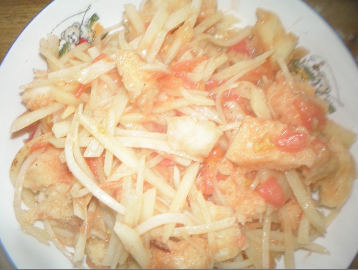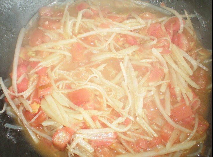 阳最近老是不好好吃饭,真是愁死人了,今天下午突然想起朋友说的西红柿泡馍的做法,就做来试试!邀请阳阳和我去一起做,我切菜,阳阳拿一个很钝的刀切馒头! ![]() 准备一个土豆,两个西红柿,一个馒头,一点葱花,姜末!(家里没有葱了,要是有葱花会更美味) ![]() ![]() ![]() 热锅,放油,油热以后放葱花姜末爆炒,放入土豆条,炒至半熟! ![]() ![]() 放入西红柿,放入盐,花椒,鸡精,翻炒,慢慢地鲜红的西红柿汁就出来了! ![]() 阳阳自己动手切的馍花儿,也准备好了!,再放入馍花儿翻炒一会儿!成功! ![]() ![]() 出来,盛到阳阳最喜欢的小碗里,阳高兴的吃了一大碗! ![]() 还高兴地问我,:“我切的馍馍好吃吧!”“嗯,好吃好吃!”我高兴的回答! 再配上我凉调的黄瓜丝和绿豆小米稀饭,早餐就解决了! ![]() 太好吃了 ![]() 现在这个季节西红柿大量上市,营养价值也高,可以用茄子啊,豆腐啊,什么的孩子爱吃的蔬菜来代替土豆,西红柿多了也不拍,越多汁越多,越好吃!对于爱吃番茄酱的孩子来说,真的是一道美味哦!