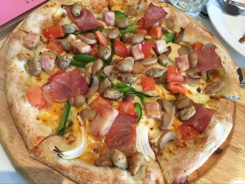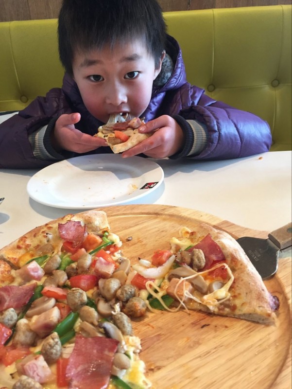 很快,食物就上来了,点点负责吃,我就给他拍照,感觉披萨还是不错的,这样一个披萨只要二十四元,上面还有牛肉和培根,是店里的招牌至尊披萨,材料很丰富,披萨也不是很厚,吃起来薄薄脆脆的。